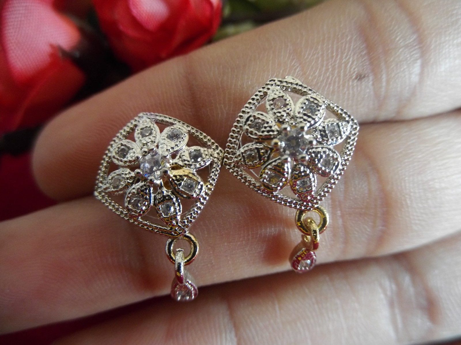 But the beauty of these earrings doesn’t end there. Delicate small hanging AD drops gracefully dangle from the bottom of the earrings, catching the light with every movement and adding a touch of glamour to your ensemble.