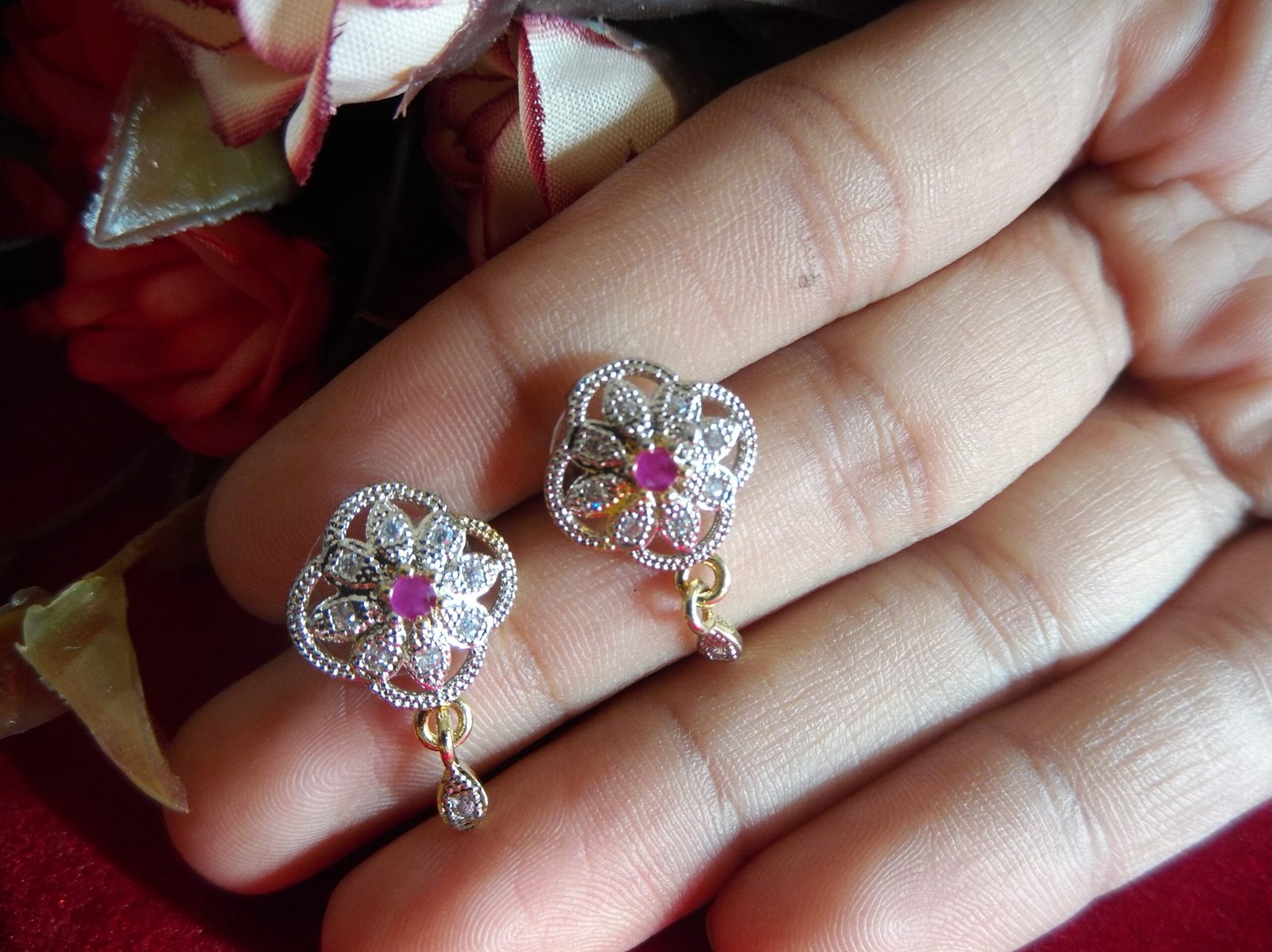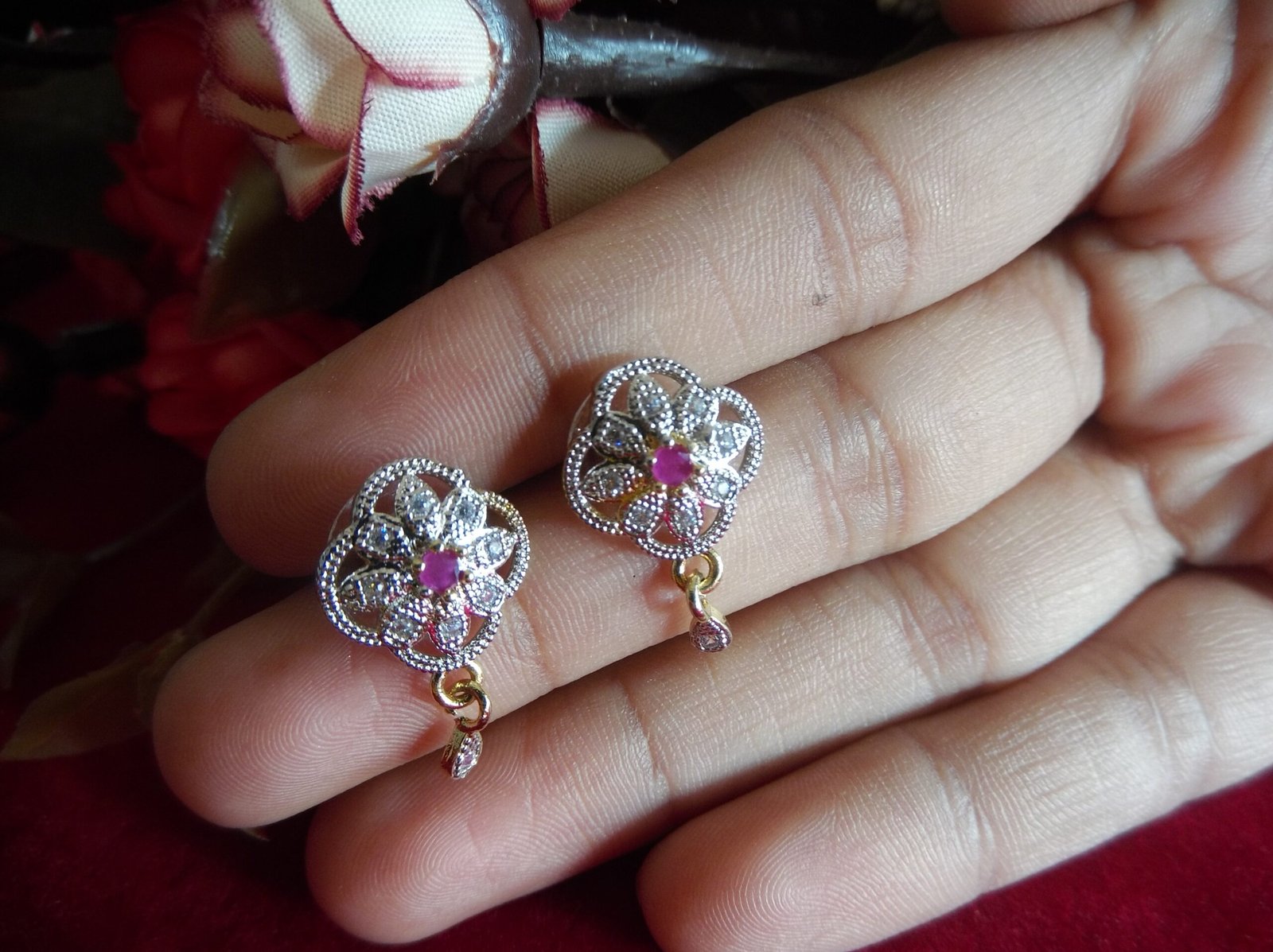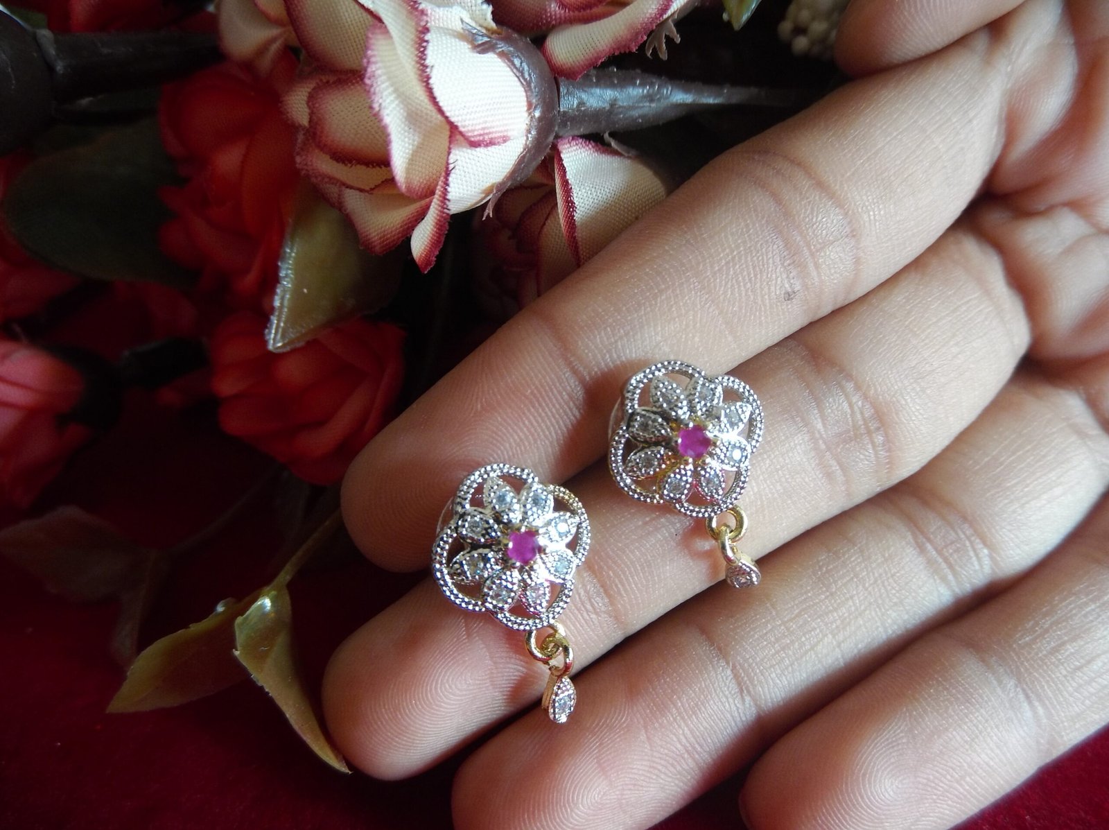 At the heart of the flower lies a mesmerizing ruby-colored stone, radiating warmth and sophistication. The delicate petal design is enhanced by the exquisite detailing, while small hanging AD drops add a touch of movement and grace to the ensemble.