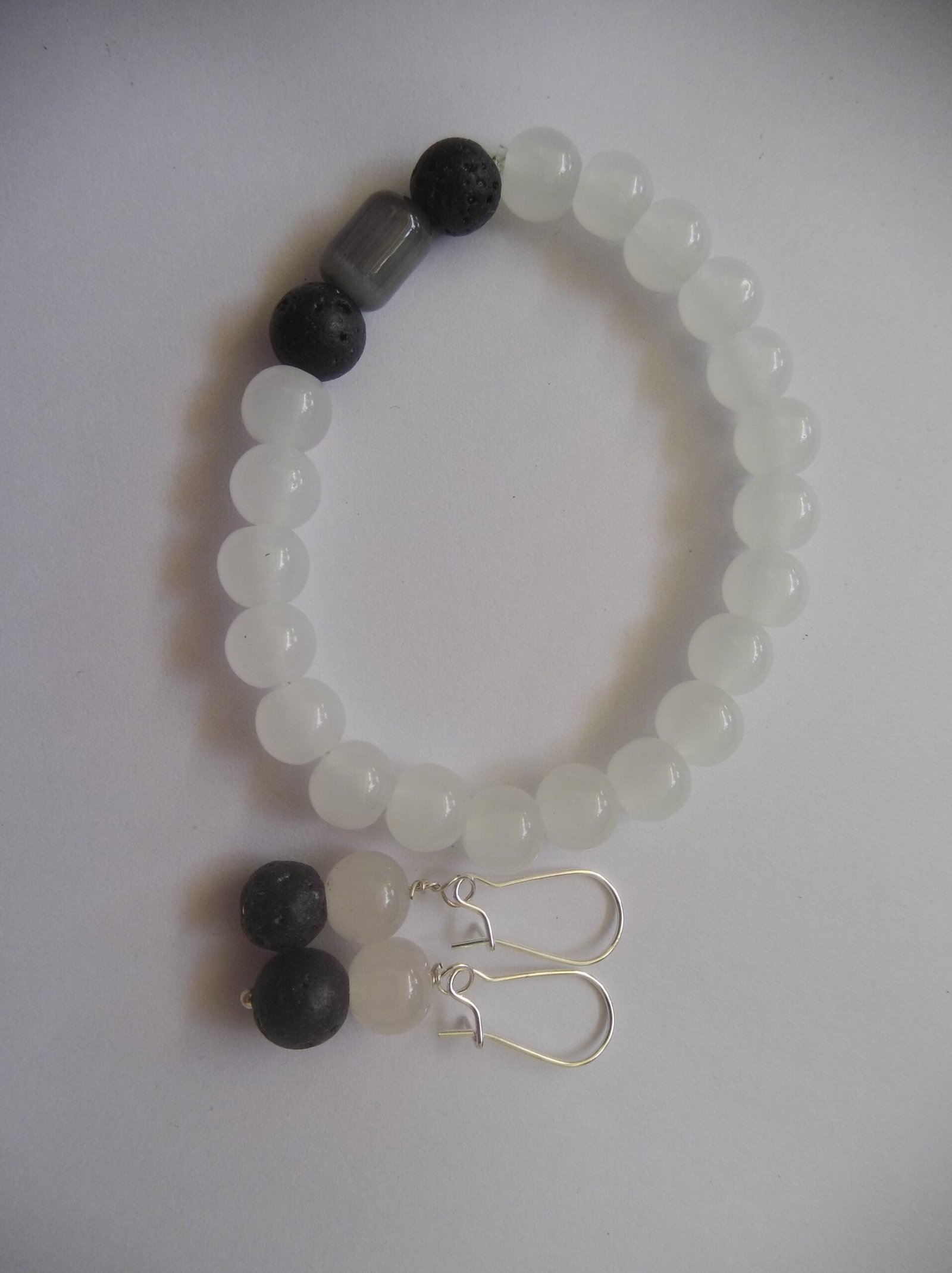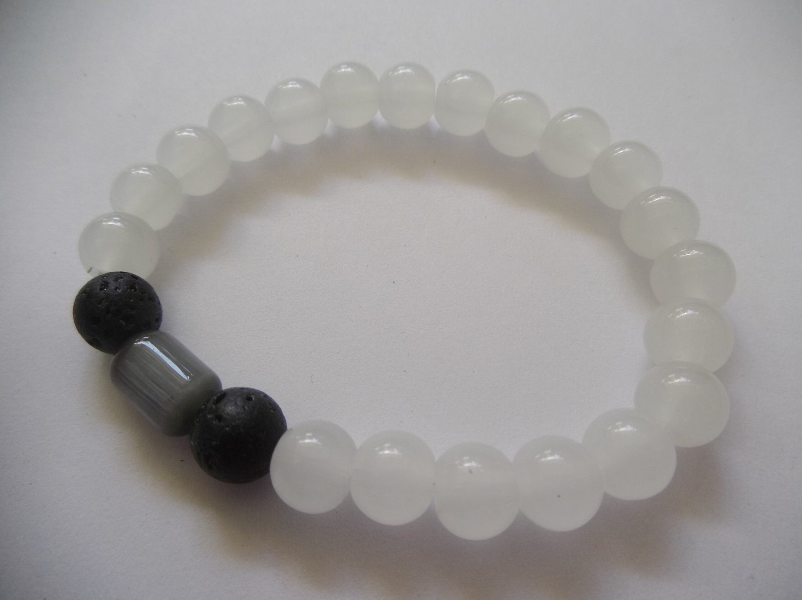 Stylish Accessory: Handcrafted beaded bracelet featuring white gemstone beads and contrasting black lava beads for a chic, eye-catching design.
