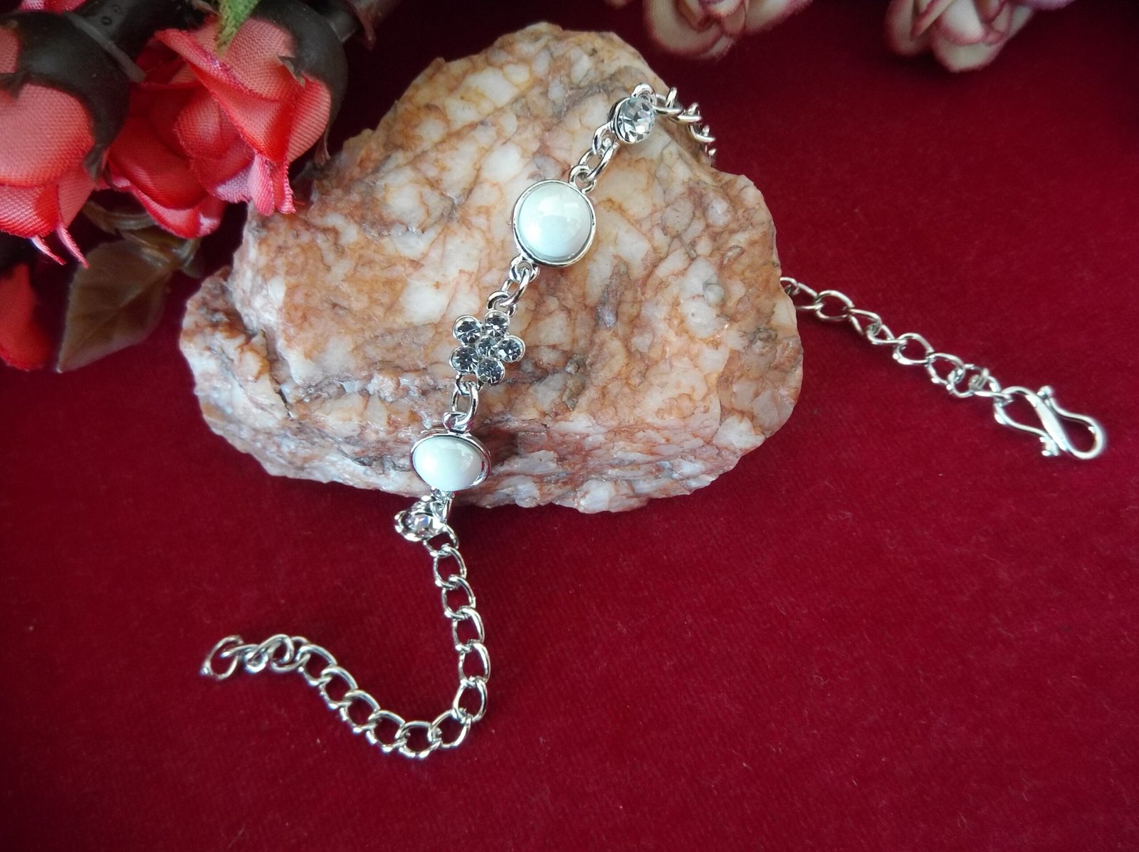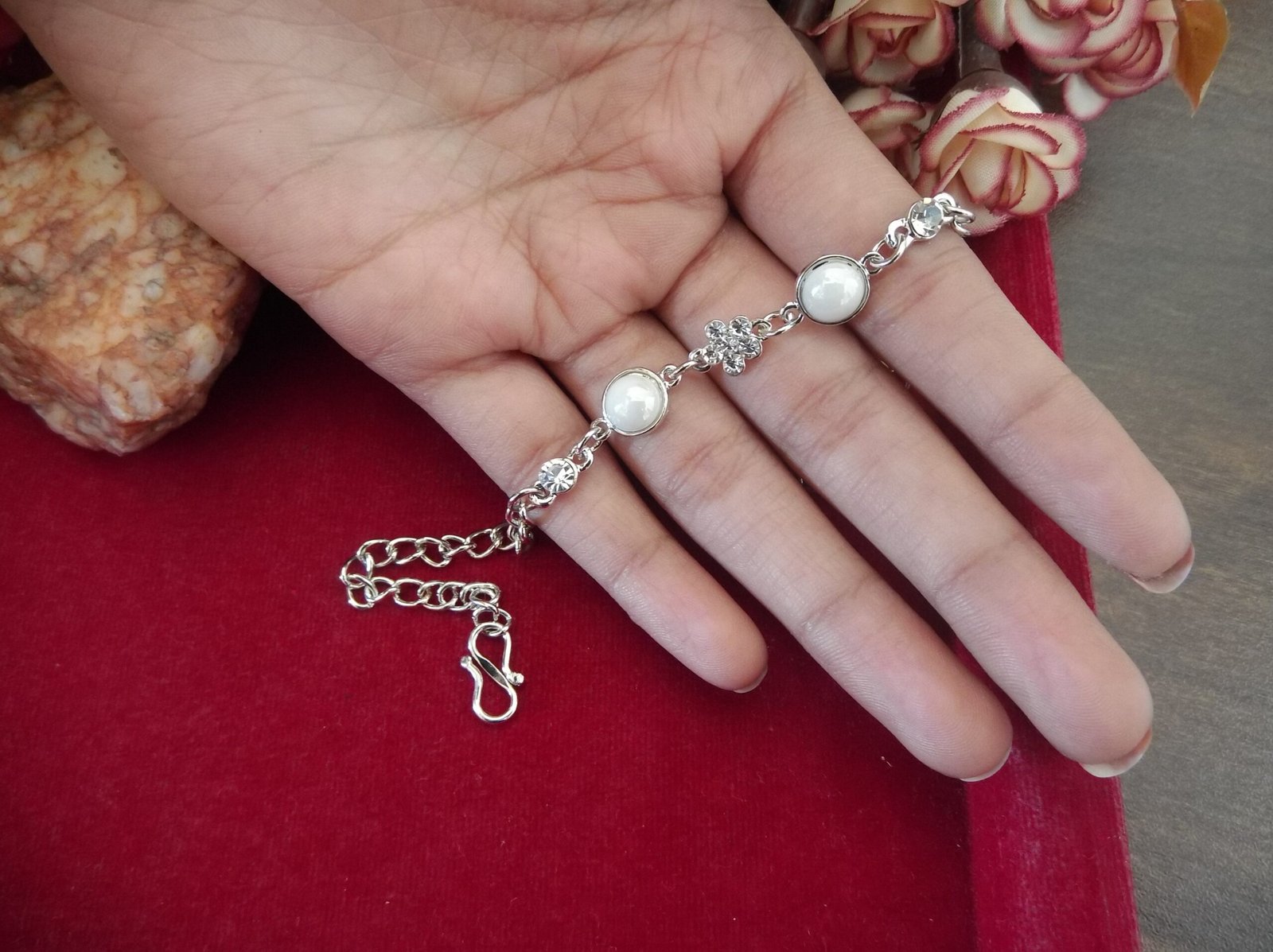 Indulge in the epitome of elegance with our Silver Metal Ladies Chain Bead Bracelet, a masterpiece of craftsmanship and style. This bracelet features a stunning centerpiece adorned with a captivating metal flower design, accented by shimmering white stones that exude sophistication and grace.
