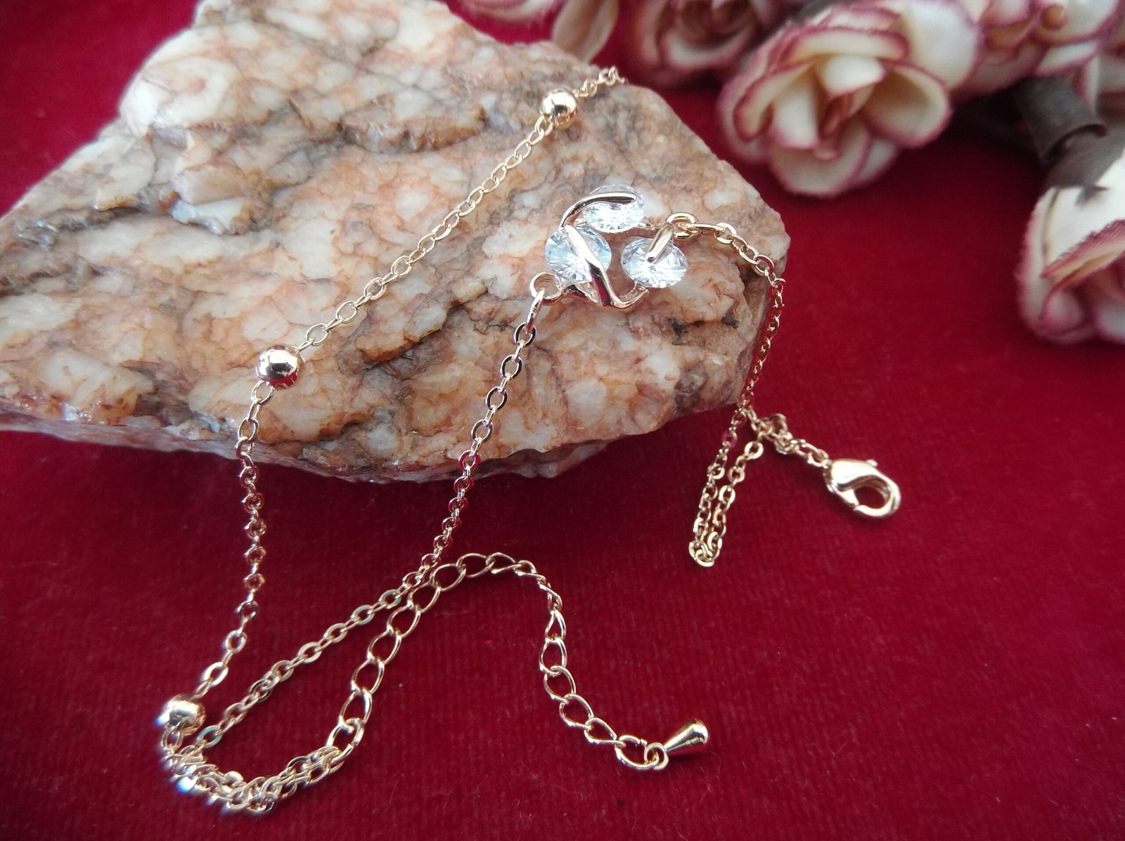 Introducing our captivating Rose Gold Metal Ladies Chain Bead Bracelet, a statement piece that effortlessly combines elegance and sophistication. At its heart lies a beautiful arrangement of three sparkling stones, delicately locked within matte metal settings, creating a mesmerizing focal point. Surrounding these stones are small metal balls, adding an extra dimension of texture and allure to the bracelet. Each detail exudes refinement and grace, elevating your ensemble with understated glamour. Whether worn alone or paired with other accessories, this bracelet is sure to enhance your style and elevate your look with timeless elegance.