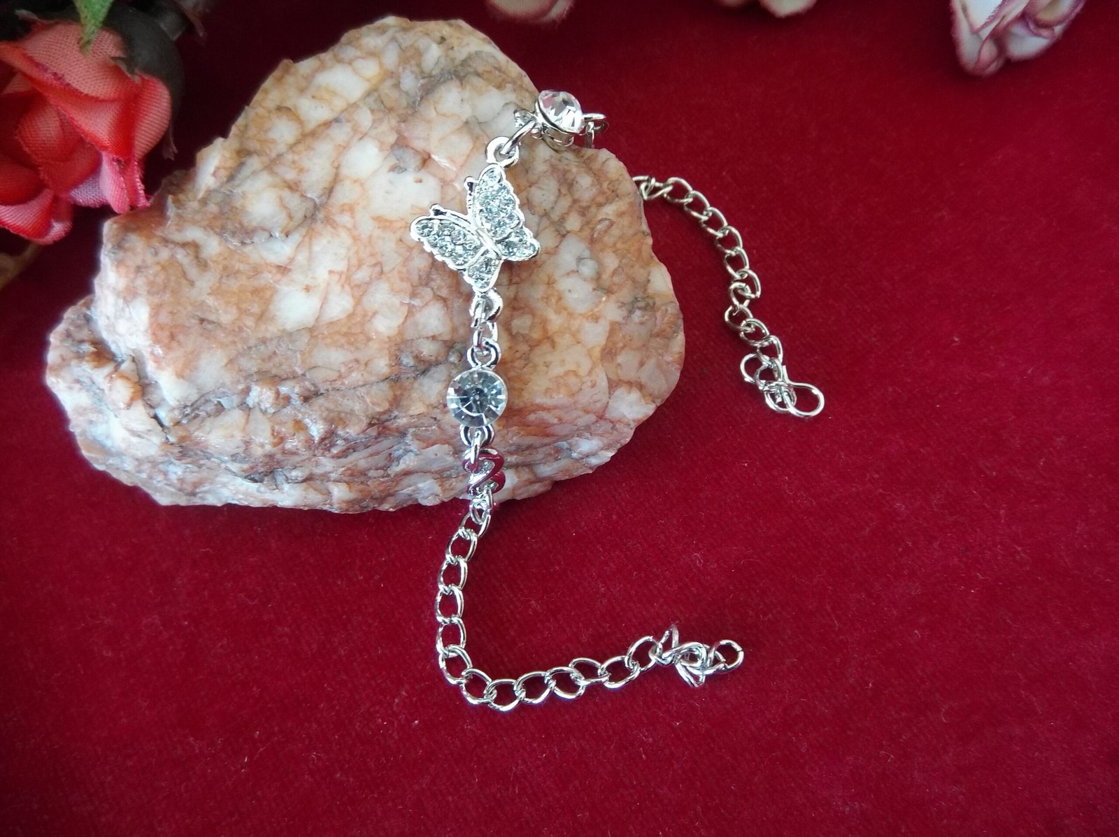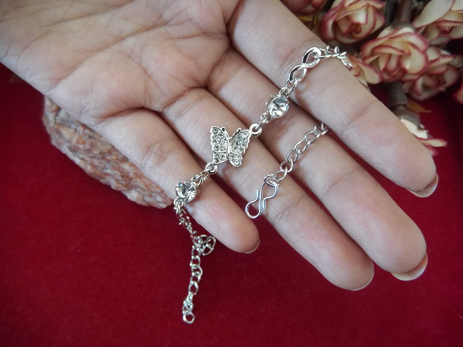 Immerse yourself in elegance with our Silver Metal Ladies Chain Bead Bracelet, a captivating piece designed to elevate your style. At its center lies a breathtaking metal butterfly adorned with dazzling white stones, exuding a timeless charm. Delicately inscribed in white metal, the word “love” adds a sentimental touch, making this bracelet a perfect gift for someone special. With sparkling white stones adorning both sides, this bracelet catches the light with every movement, adding a subtle yet stunning sparkle to your look. Crafted with attention to detail, this bracelet is a true symbol of sophistication and grace. Wear it alone for a subtle statement or stack it with other bracelets for a layered look. Embrace elegance and beauty with our Silver Metal Ladies Chain Bead Bracelet, a must-have accessory for any jewelry collection.