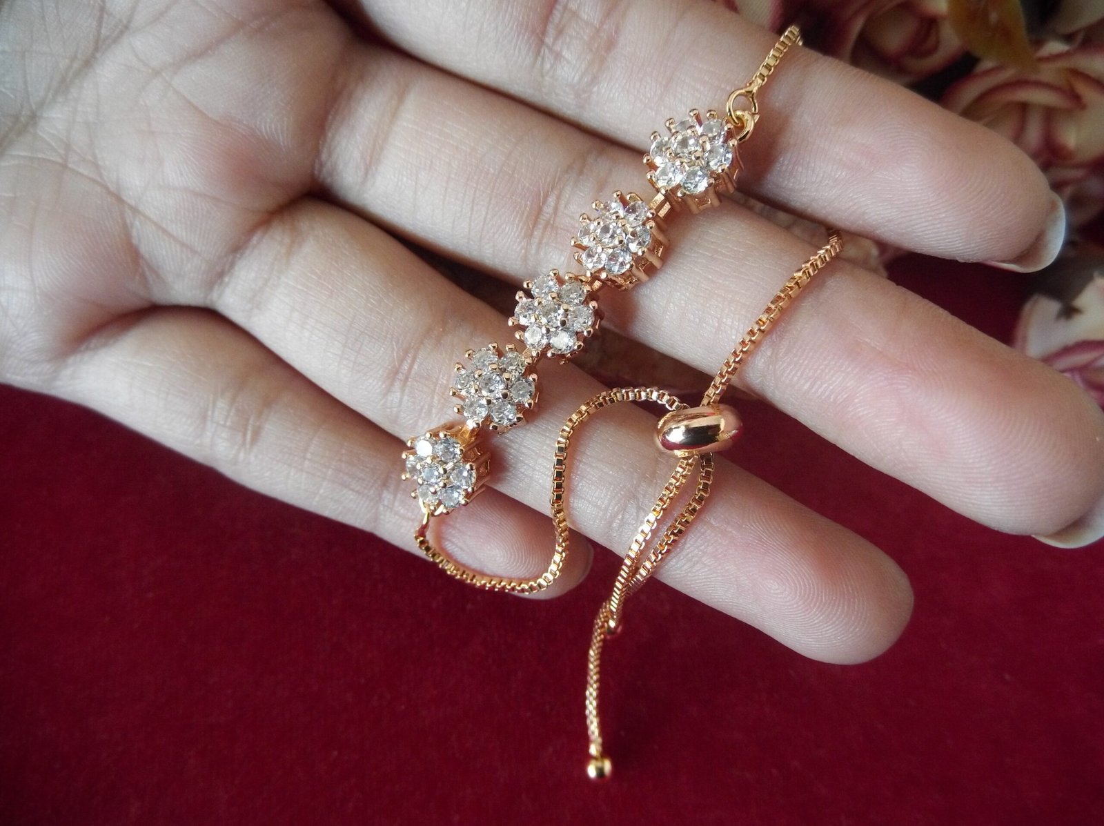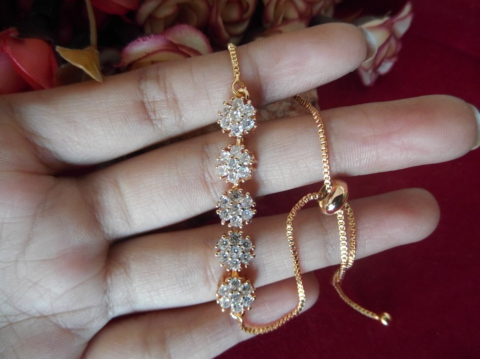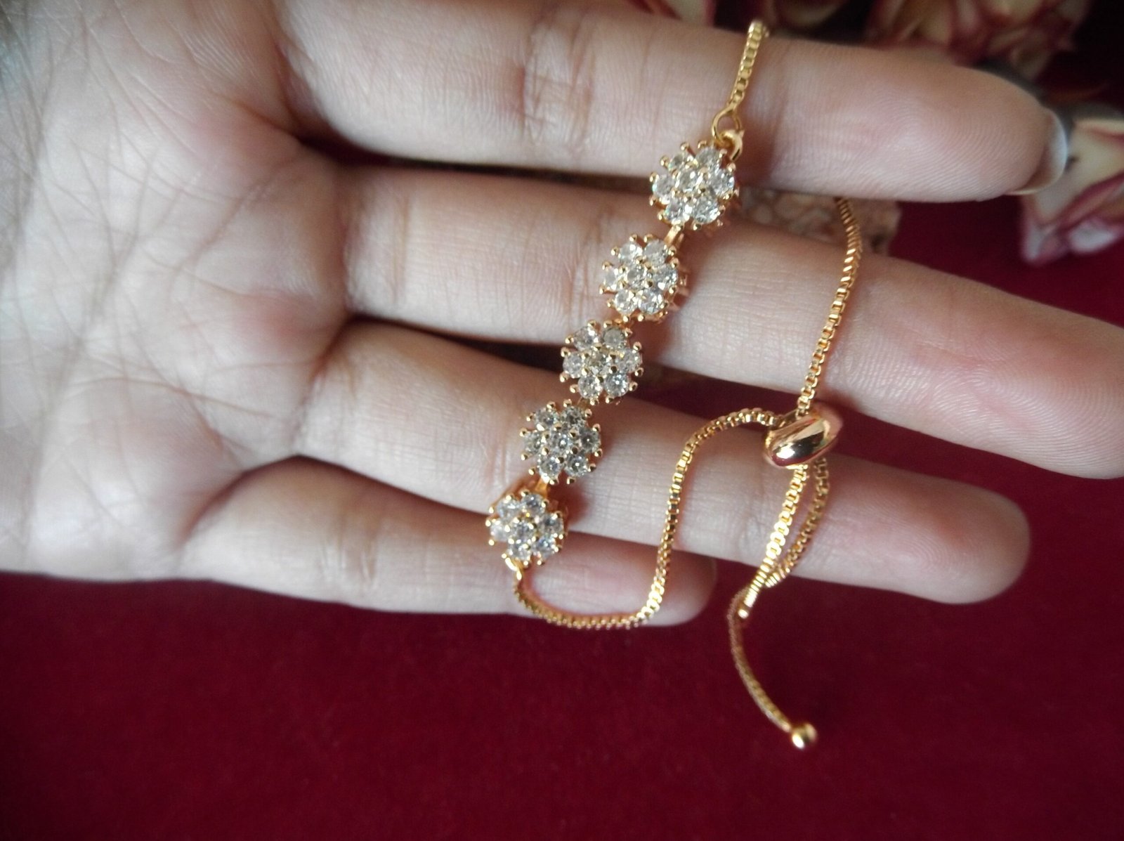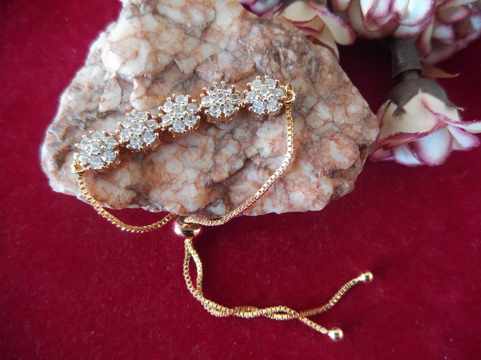 Introducing our exquisite Golden Metal Ladies’ Chain Bead Bracelet, a harmonious blend of elegance and charm that’s bound to enchant. Adorning this bracelet are five delicate flower designs, each intricately crafted with small sparkling stones that shimmer and dance in the light, adding a touch of glamour to your ensemble. The sliding lock mechanism ensures effortless wearability, providing a secure and comfortable fit for any occasion. Elevate your style with this timeless accessory, exuding sophistication and grace with every wear. Whether worn alone or paired with other jewelry pieces, this bracelet is sure to make a statement and become a cherished addition to your collection.