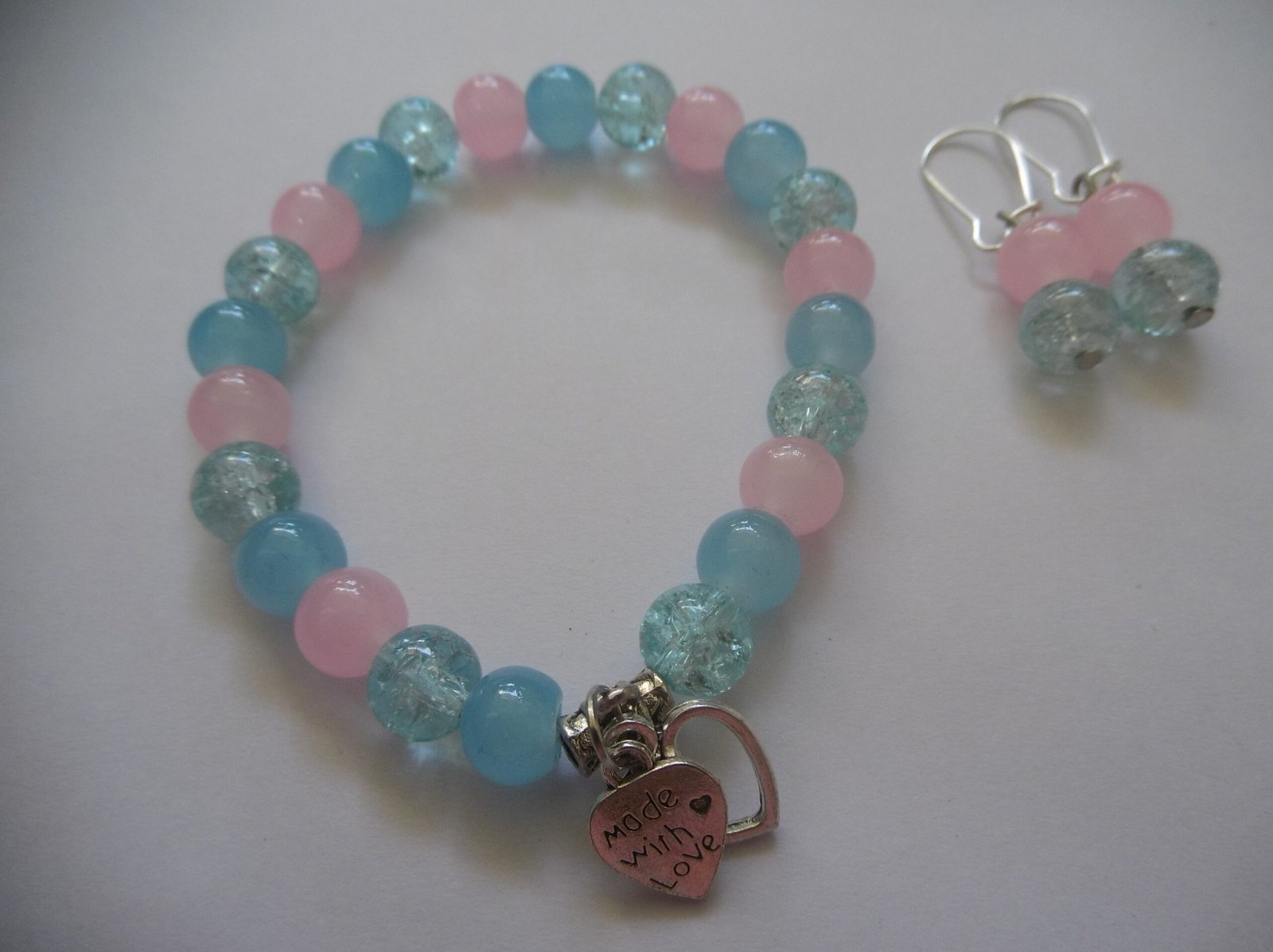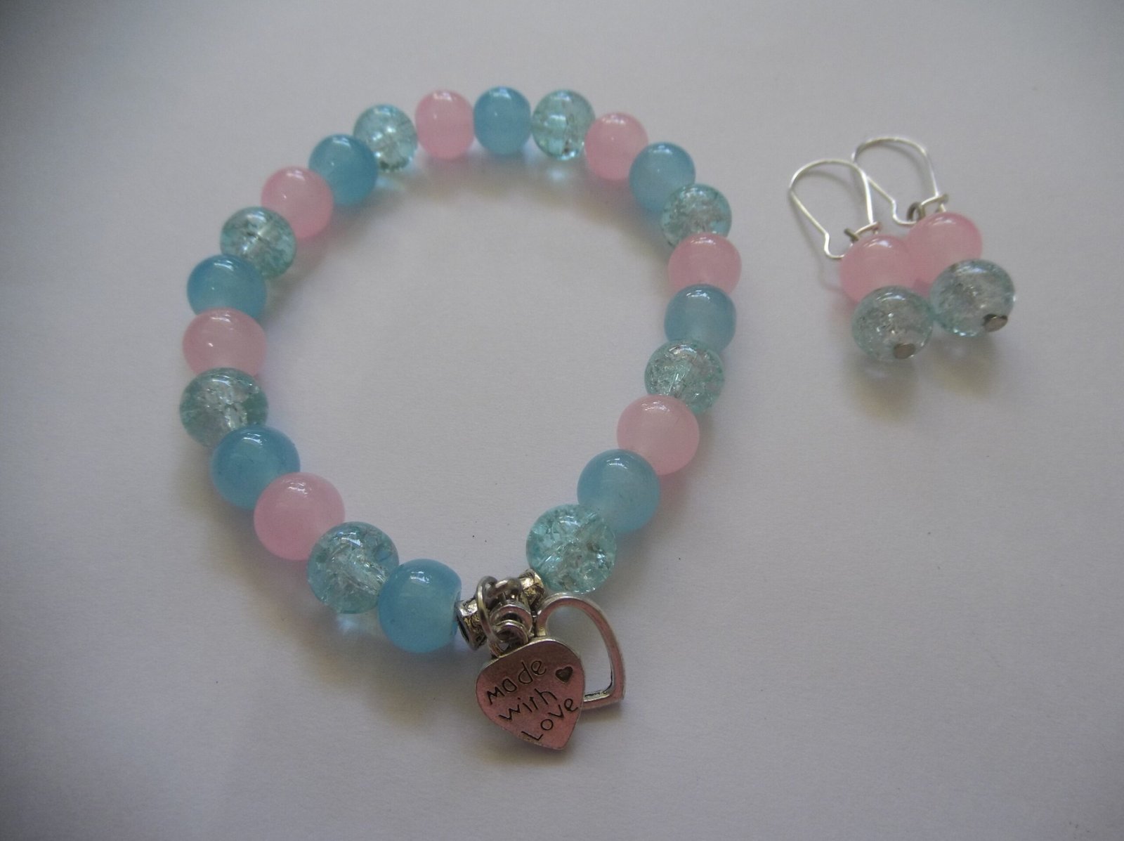 Charming White, Pink, and Blue Beaded Bracelet with Heart Charm and Matching Earrings – Adjustable Nylon Cord, Perfect for Women’s Fashion, Everyday Wear, and Special Occasions