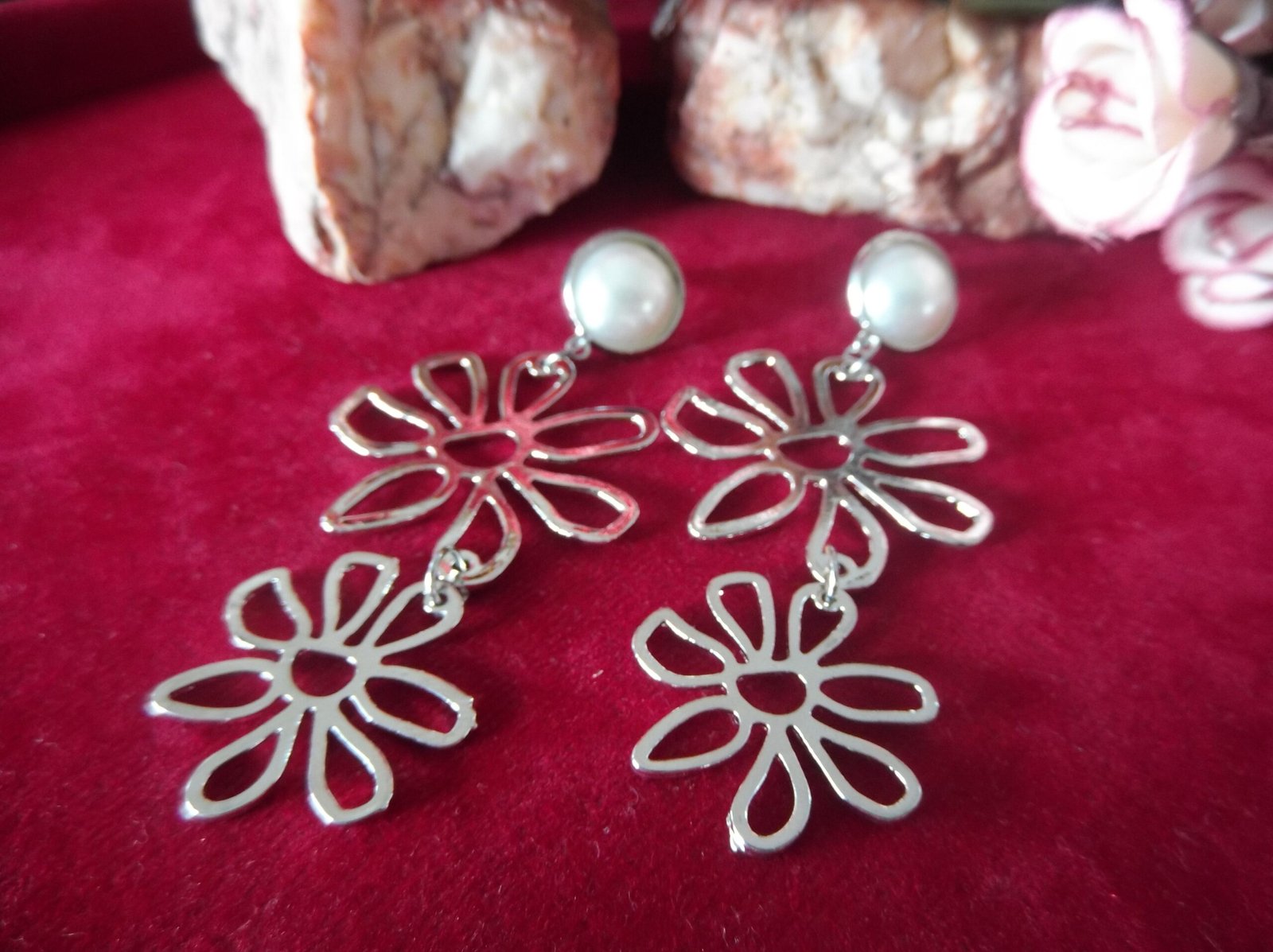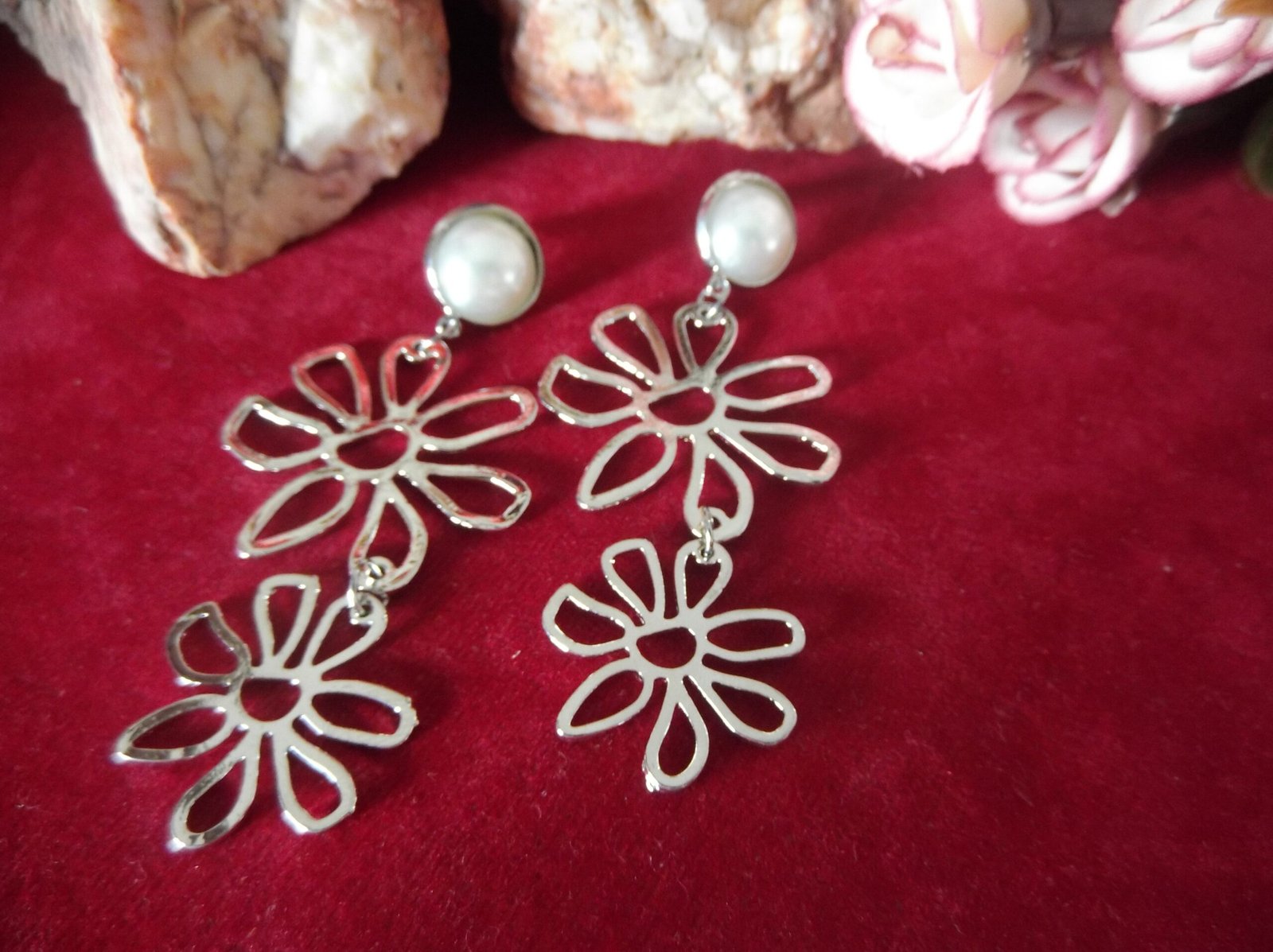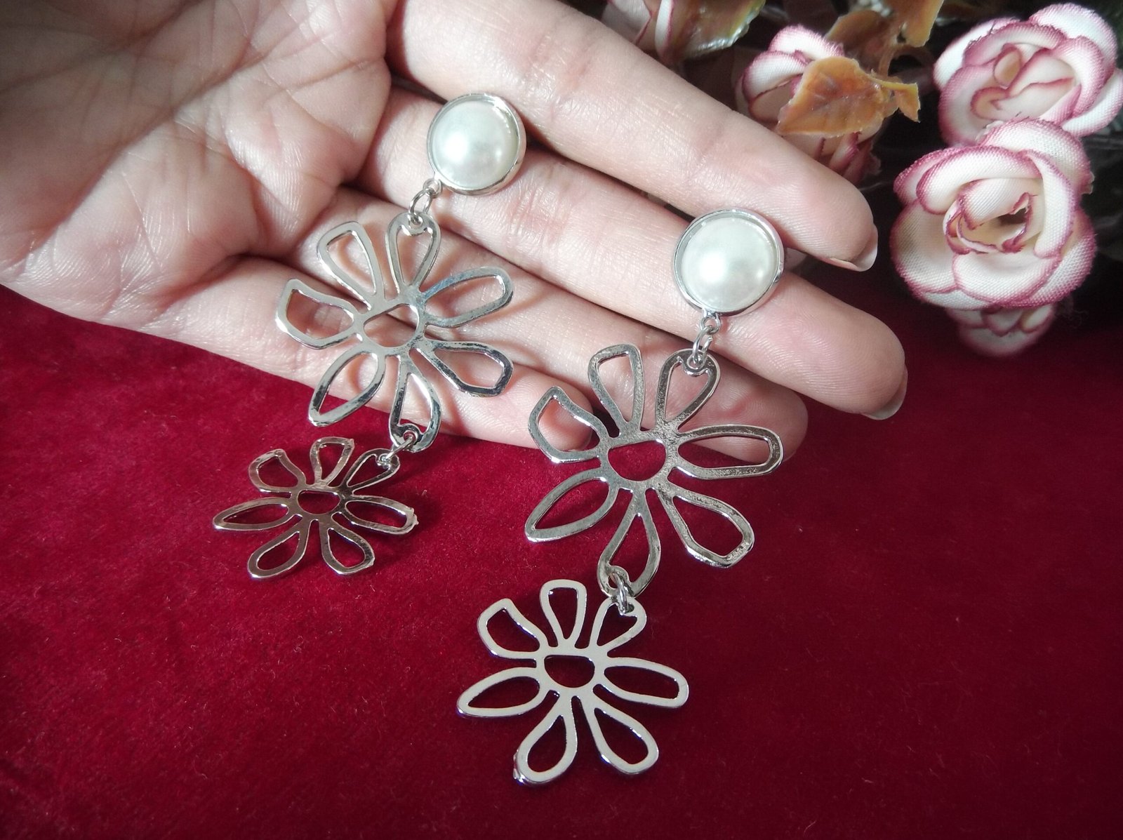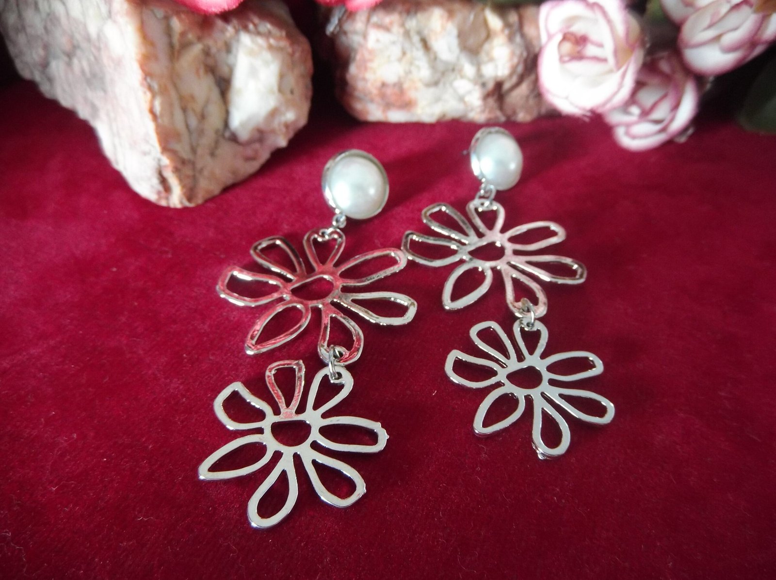 Indulge in the enchanting elegance of our Silver Metal Flower Cascade Earrings, where beauty blooms with every movement. Crafted from gleaming silver-colored metal, these earrings feature a mesmerizing design of two delicate flowers gracefully hanging one after the other. Each flower is meticulously detailed, exuding a sense of timeless charm and sophistication.