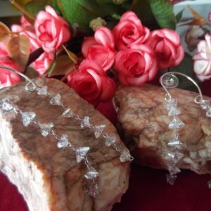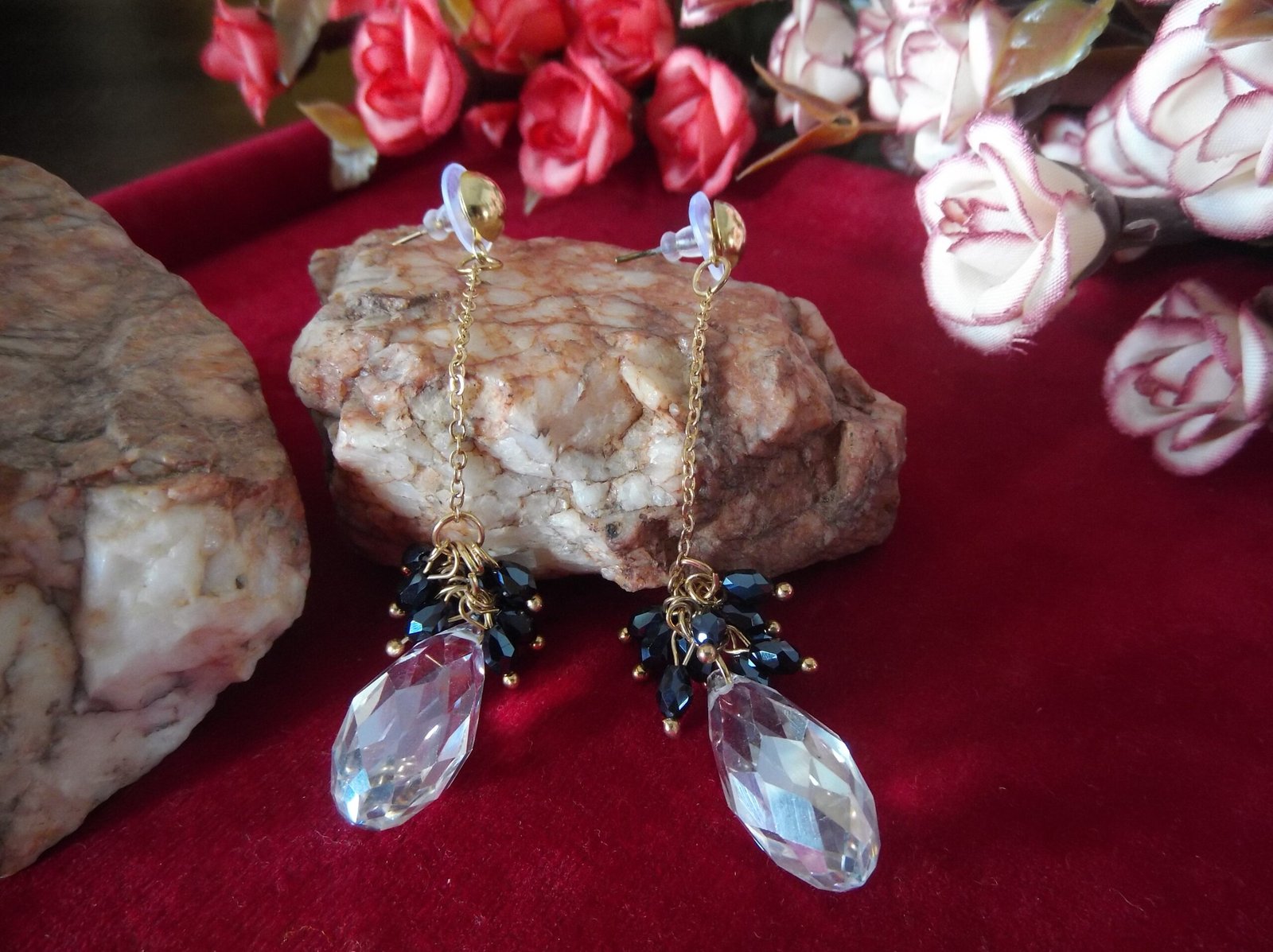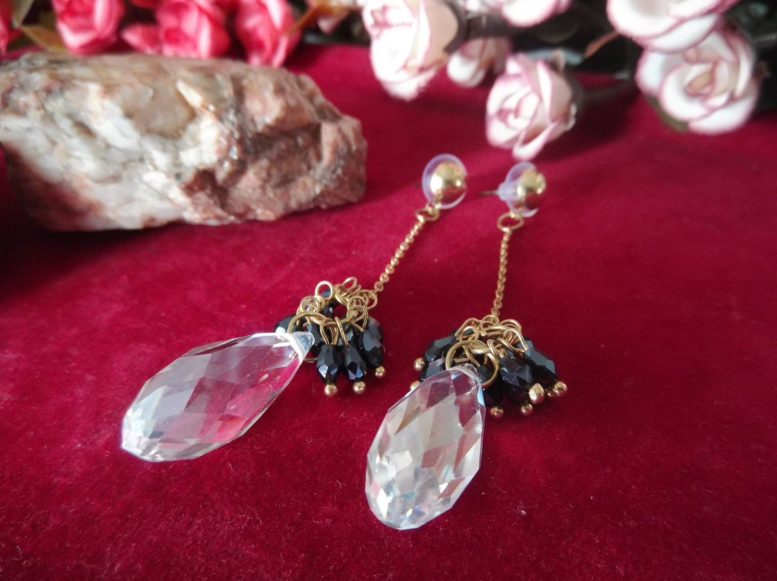 At the focal point of each earring are the breathtaking large crystal beads, gracefully suspended from the chain base. These mesmerizing crystals capture and reflect light with every movement, creating a dazzling and eye-catching effect. Complementing the shimmering crystals are the intricately arranged branches of small black beads, adding depth and contrast to the design.