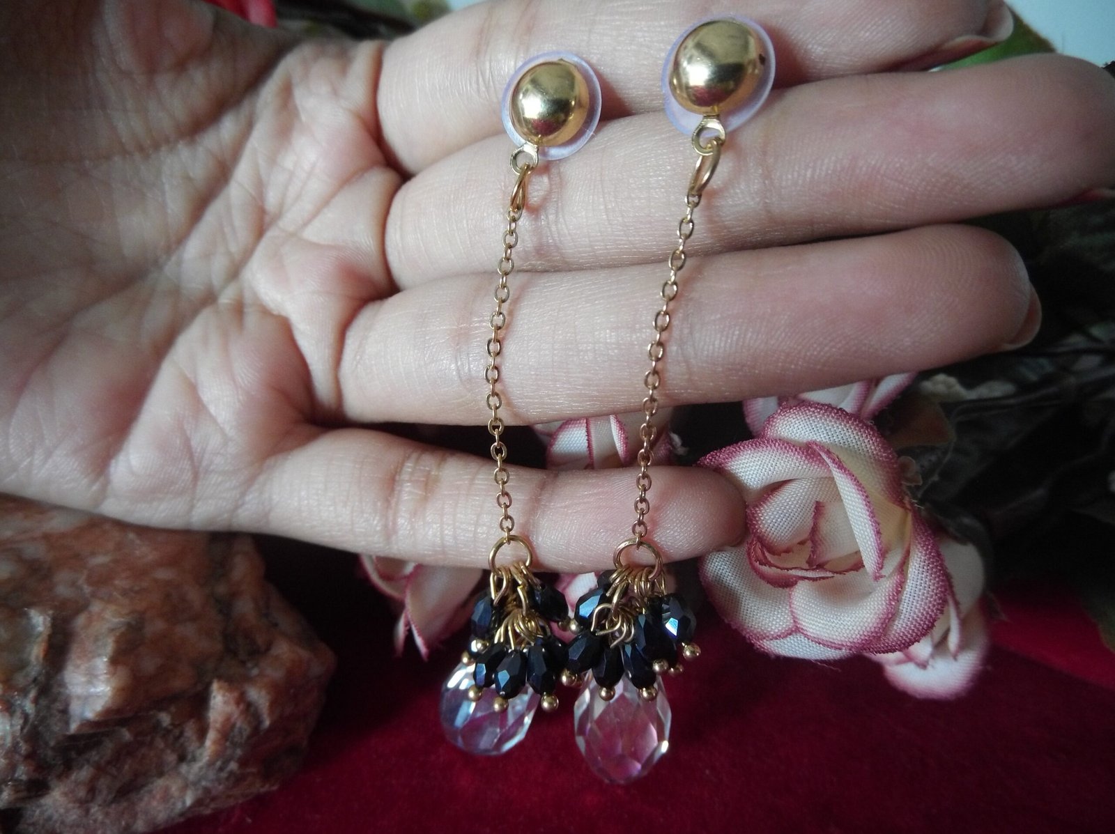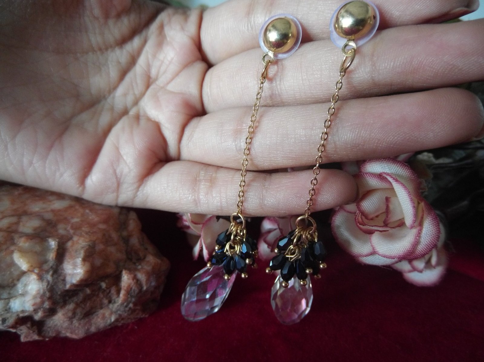 The combination of the golden chain base, the sparkling crystal beads, and the rich black bead branches results in a captivating and luxurious aesthetic. Whether worn for a special occasion or to elevate your everyday attire, these earrings are sure to make a statement and turn heads wherever you go.