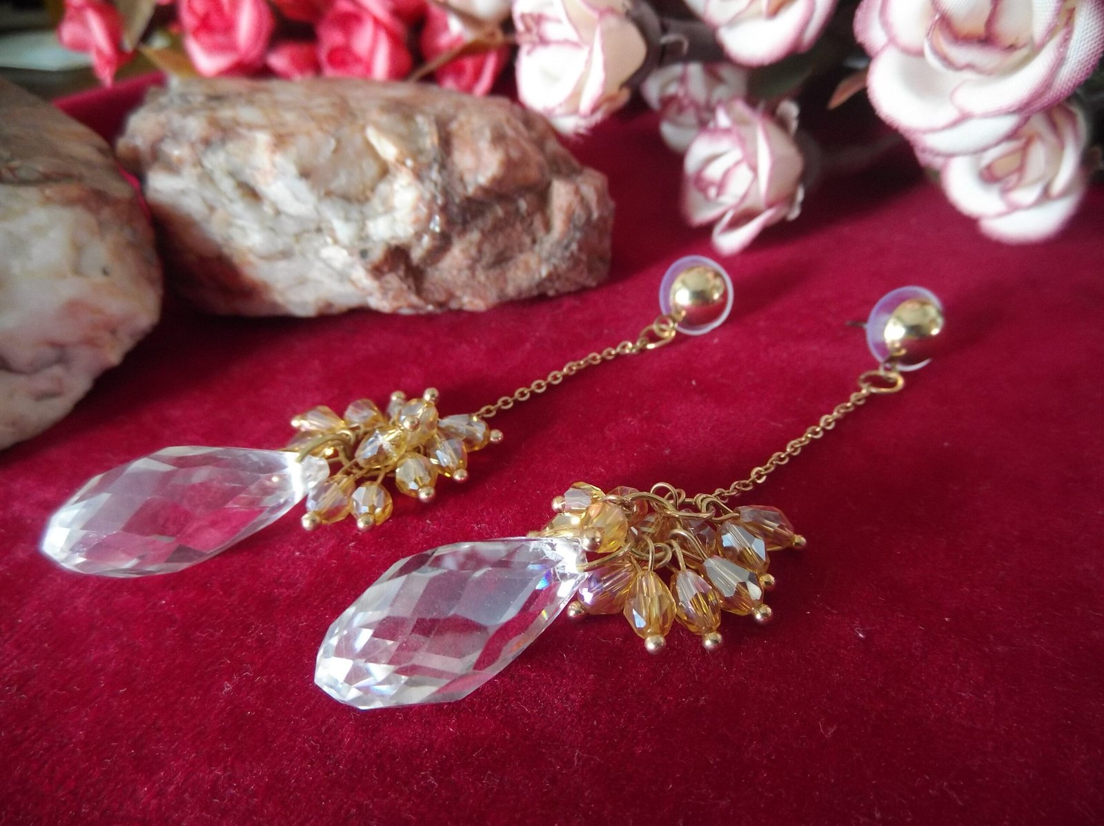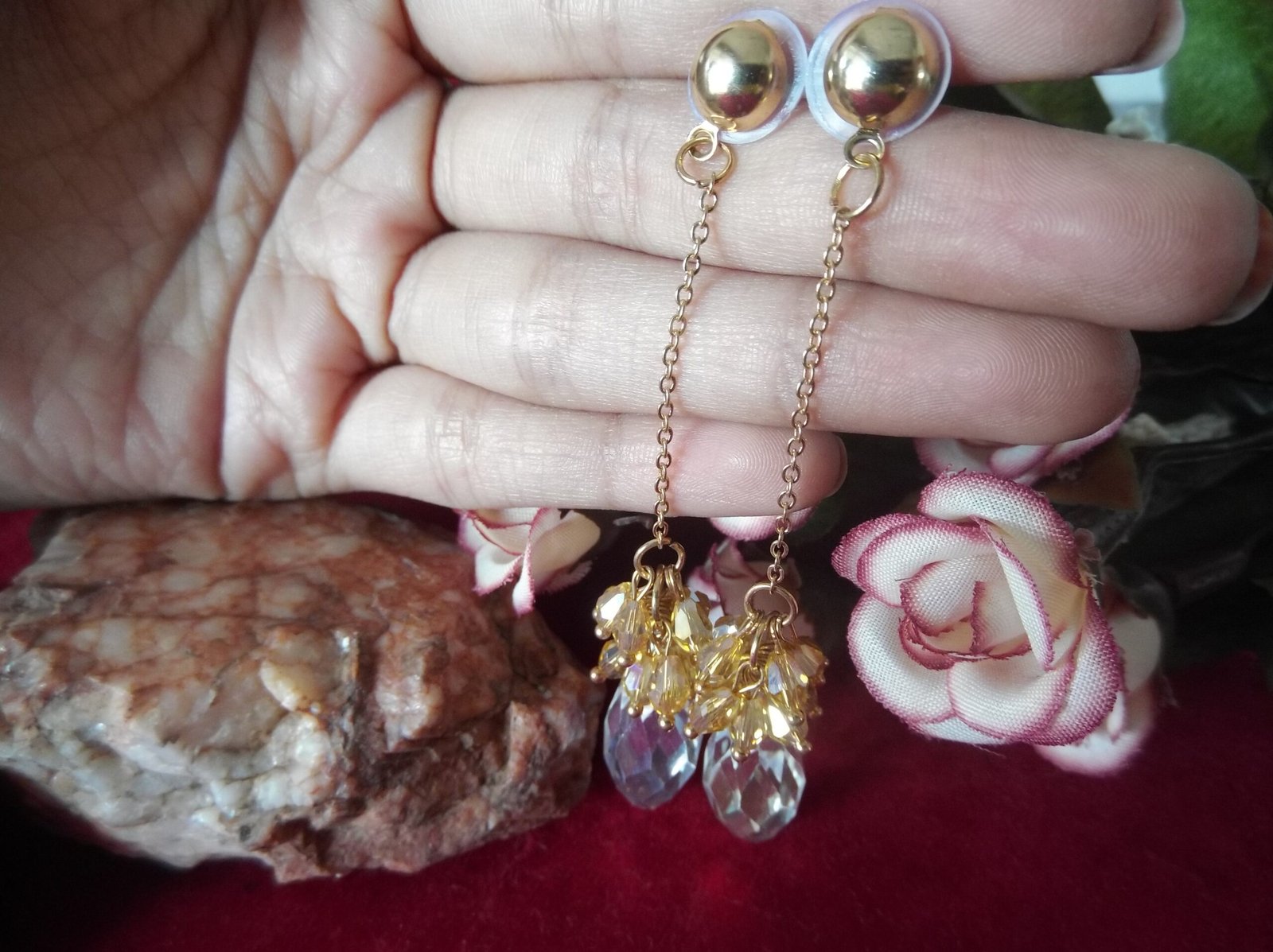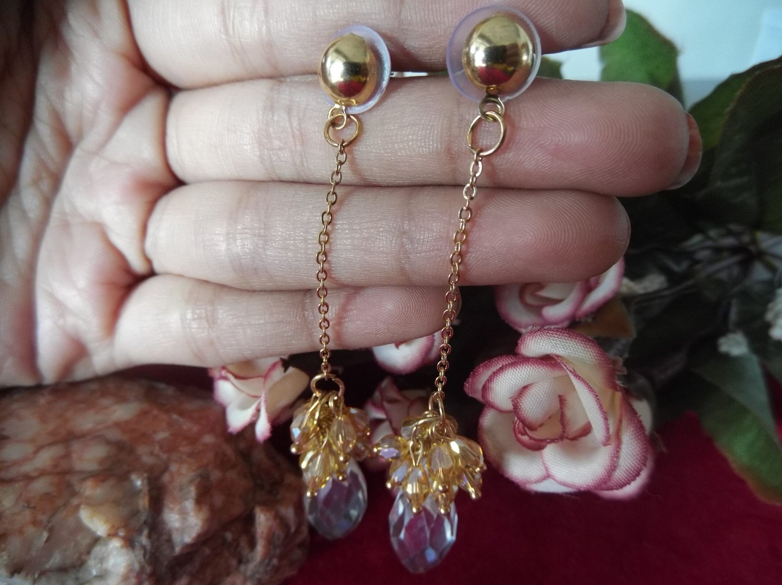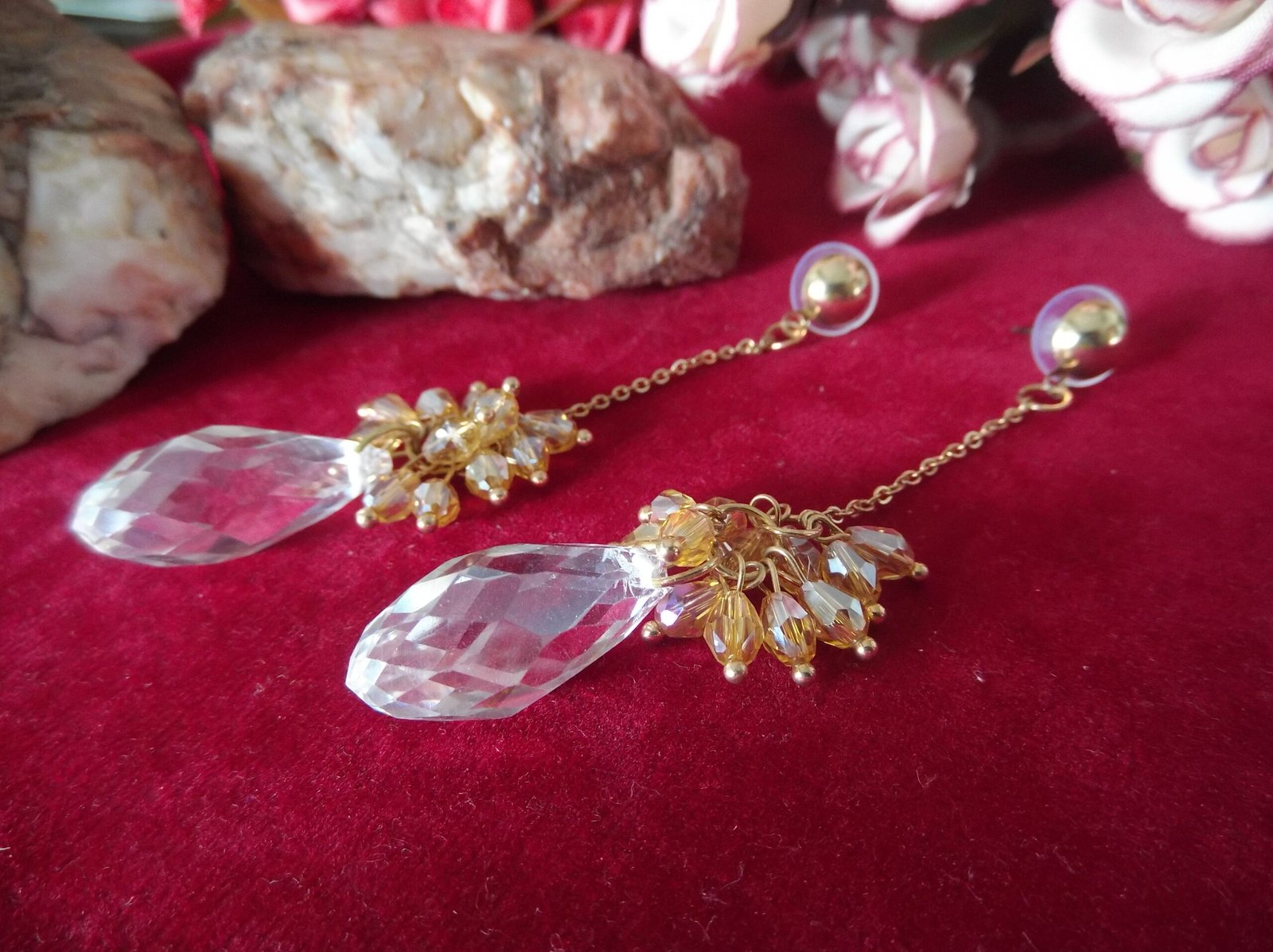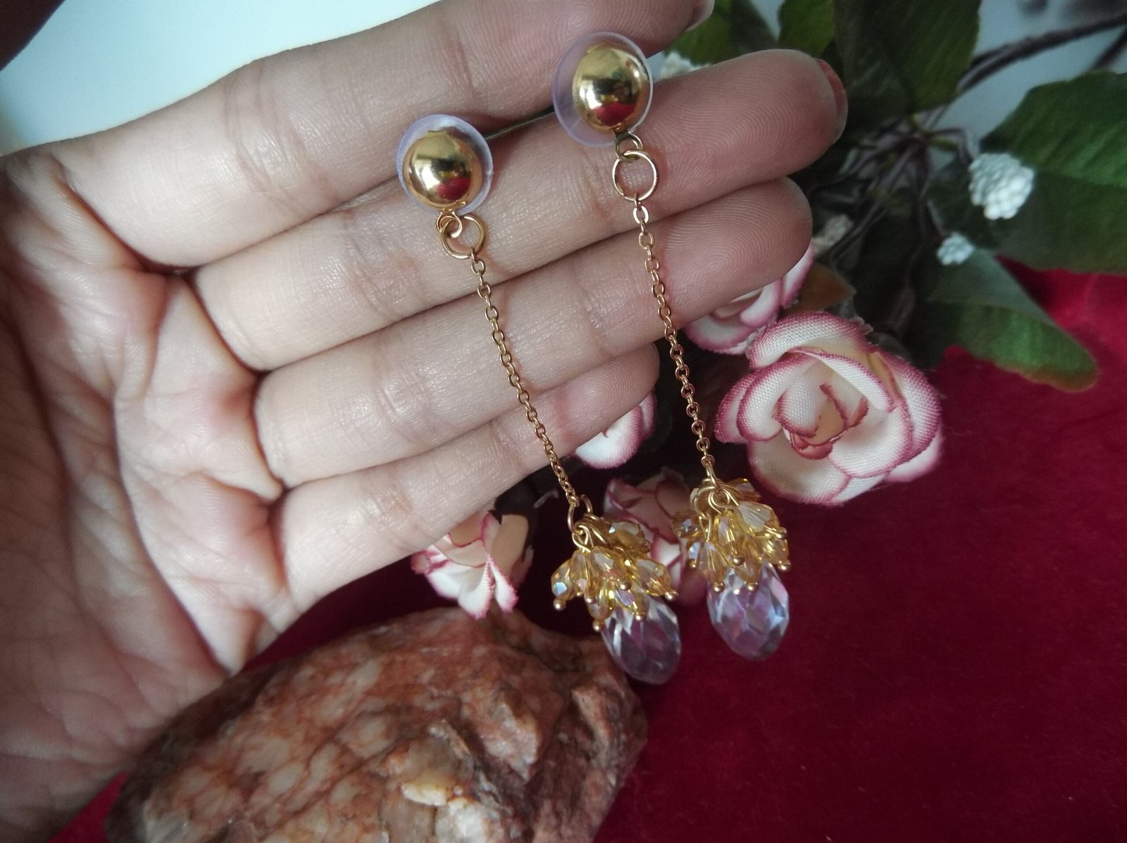 Step into elegance with our exquisite Golden-Colored Metal Chain Base Earrings. These captivating earrings boast a mesmerizing design, featuring lustrous crystal beads gracefully suspended from a golden chain. Each earring is adorned with a delicate array of small golden beads, meticulously arranged to enhance its beauty. The combination of shimmering crystals and radiant golden beads exudes sophistication and charm, making these earrings a must-have accessory for any occasion. Elevate your ensemble with the timeless allure of our stunning chain base earrings, destined to turn heads and leave a lasting impression.