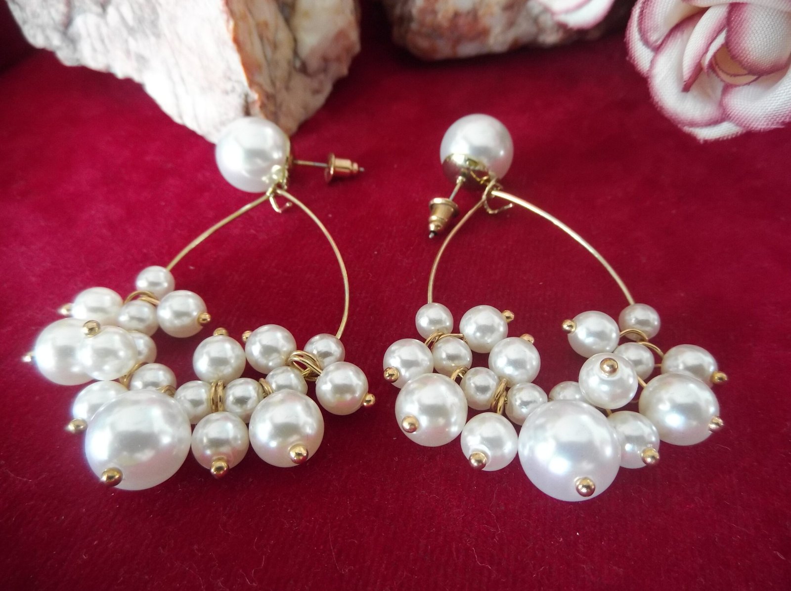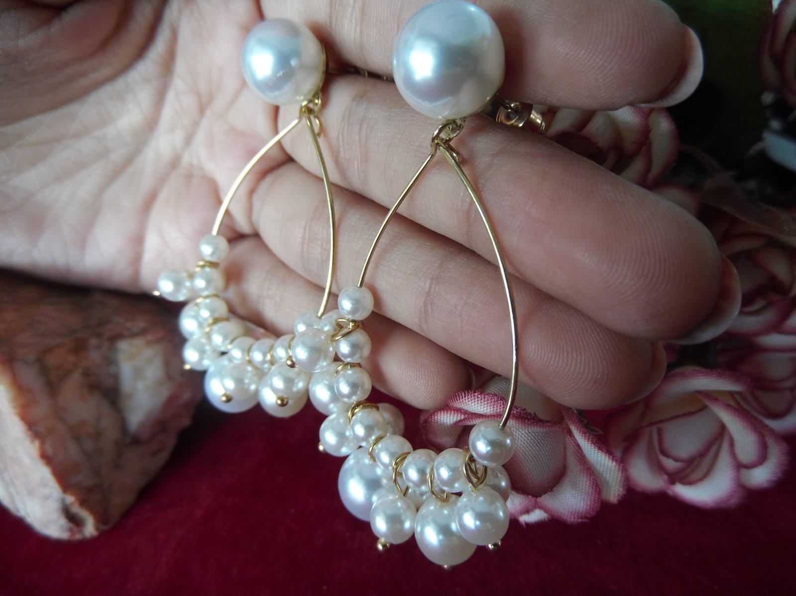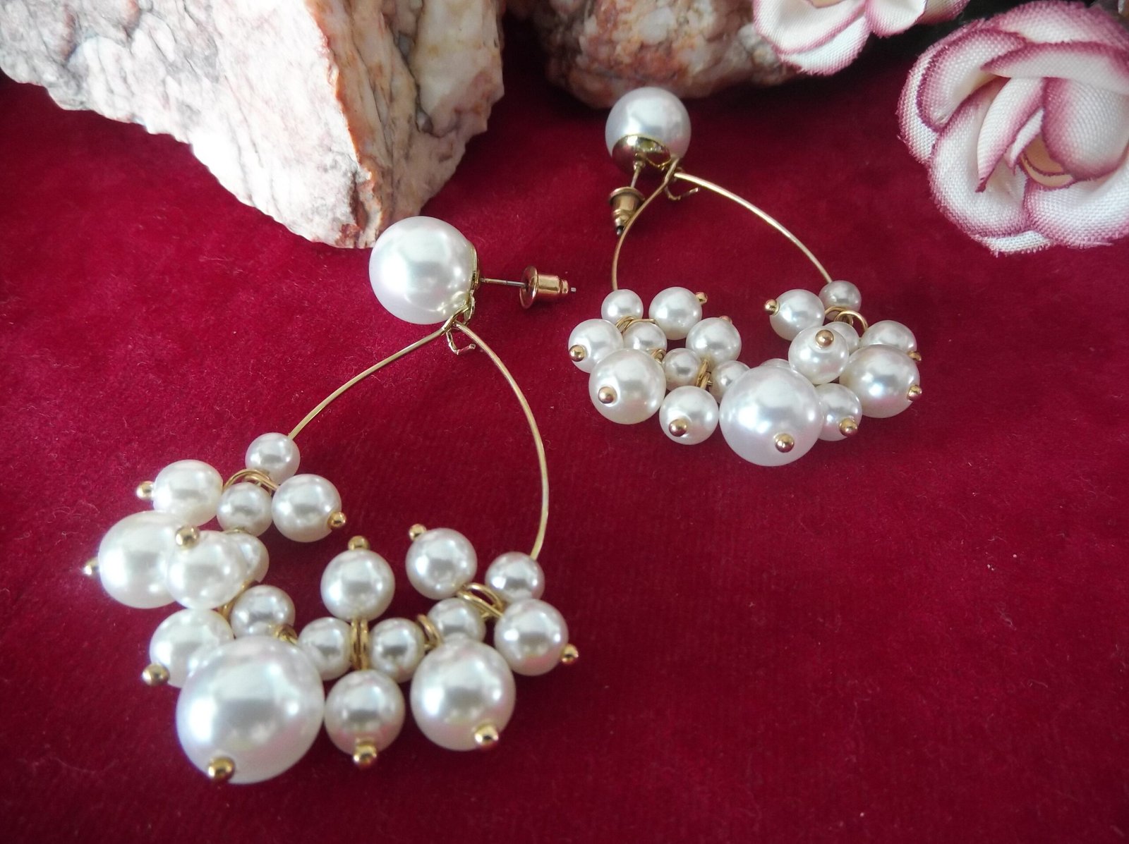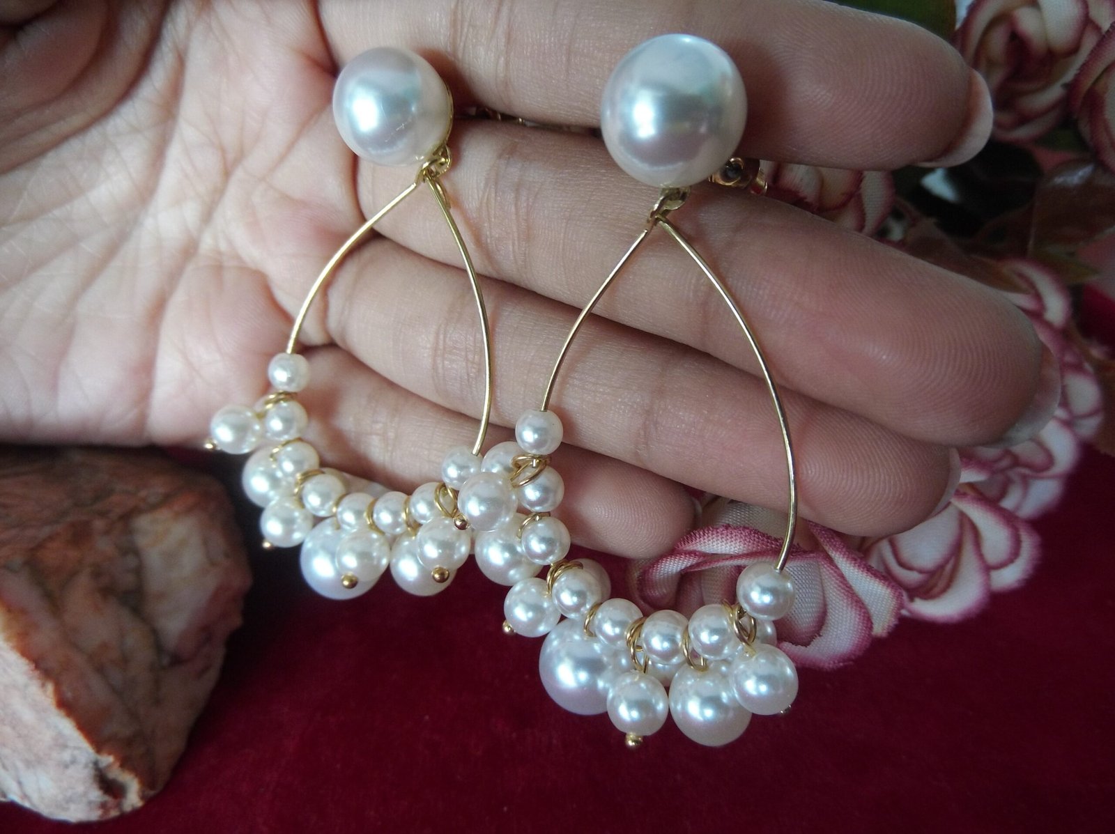 What sets these earrings apart is the beautiful embellishment of small pearl bunches adorning each hoop. Delicately arranged with meticulous attention to detail, these pearl bunches add a touch of timeless elegance and feminine allure to the earrings. At the center of each pearl bunch sits a single large pearl, creating a striking focal point that commands attention.