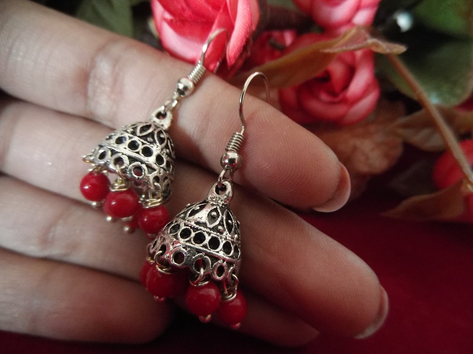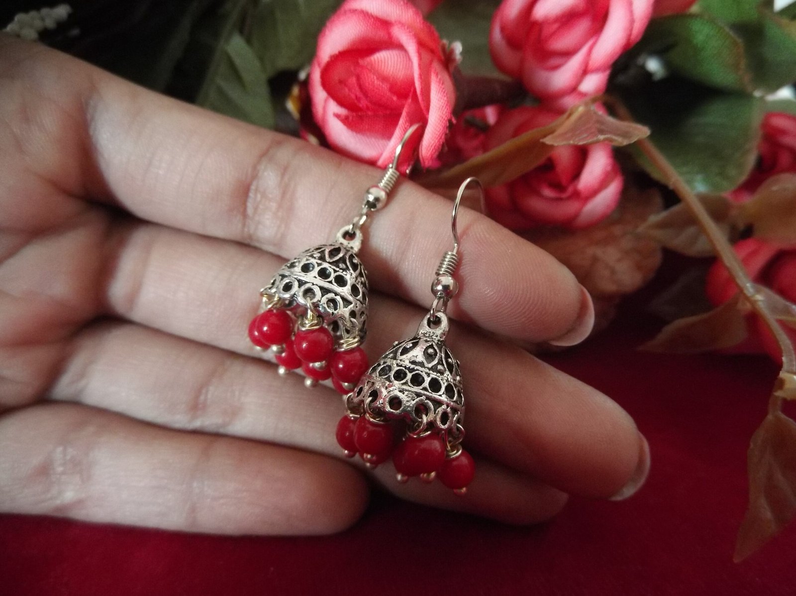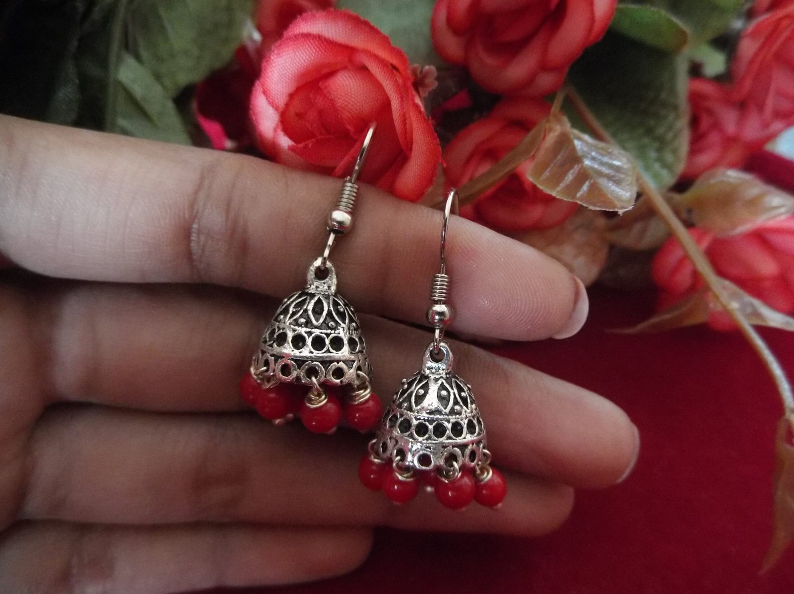 Elevate your ensemble with our Silver Color Oxidized Hanging Earrings featuring charming small Jhumki ornaments adorned with vibrant red beads. Perfect for adding a touch of elegance and sophistication to any look. “Step into a realm of timeless elegance with our Silver Color Oxidized Hanging Earrings