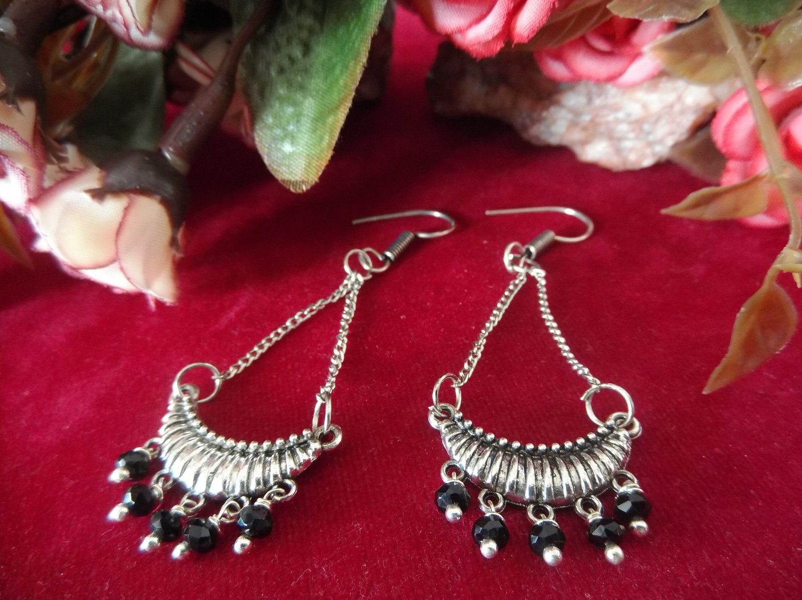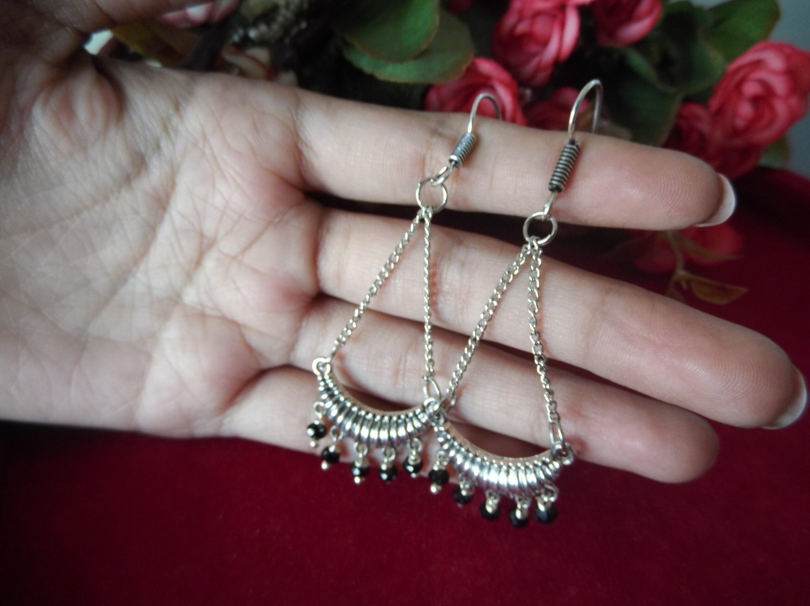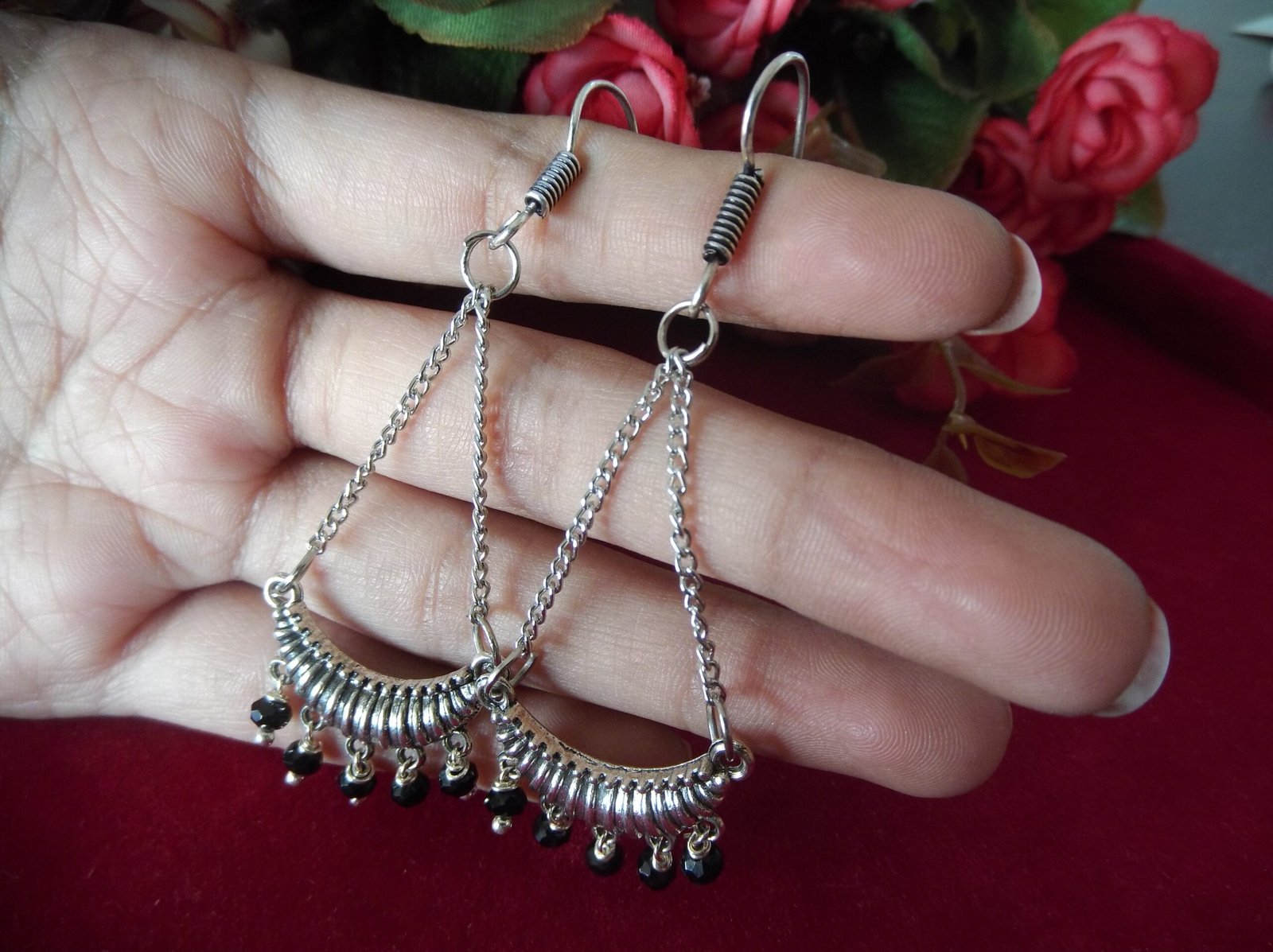 Elevate your look with our Silver Color Oxidized Hanging Earrings, adorned with sleek small black crystal beads, adding a touch of modern sophistication to any outfit.