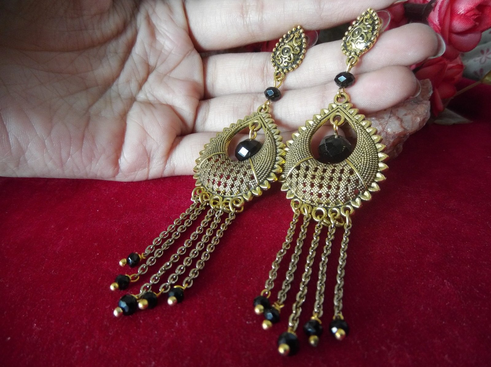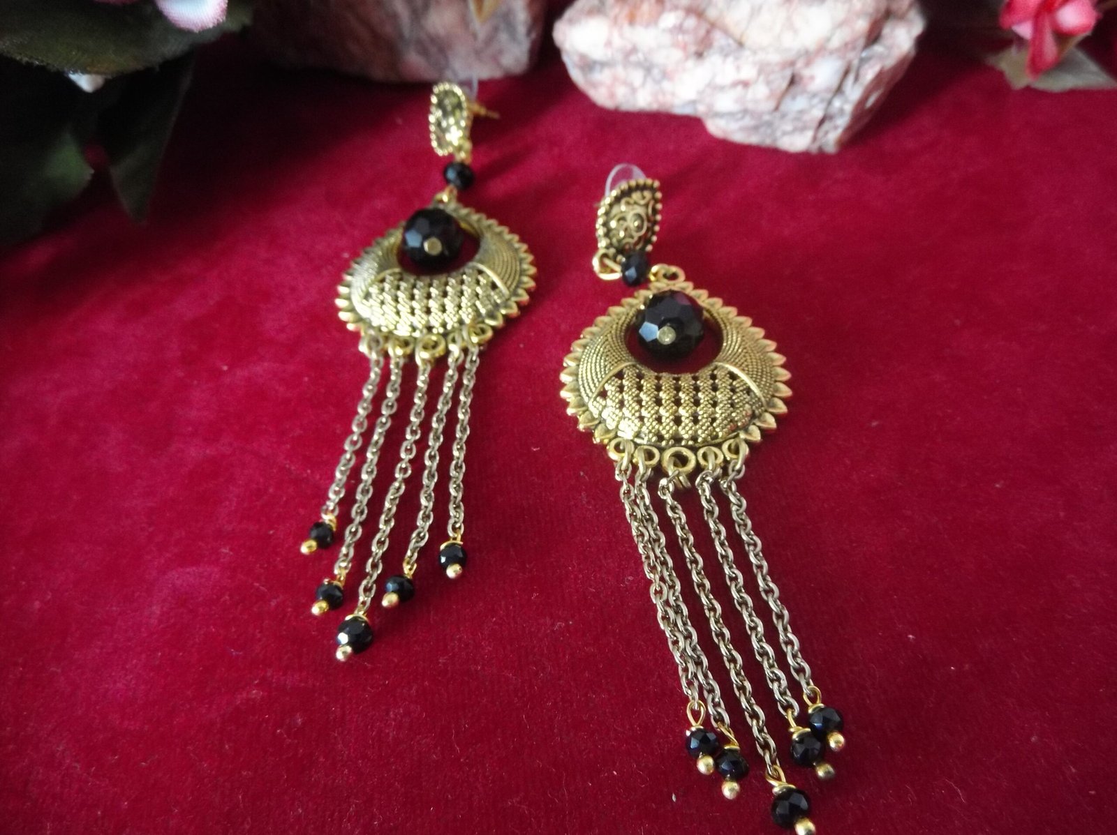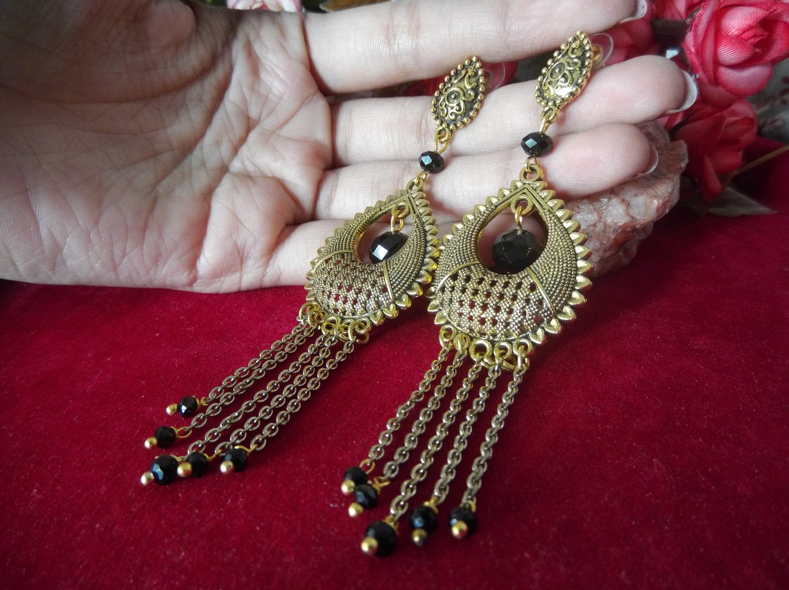 Elevate your elegance with our Golden Oxidized Earrings, featuring intricate metalwork and cascading chains adorned with captivating black crystal drops. Embrace sophistication and allure effortlessly.