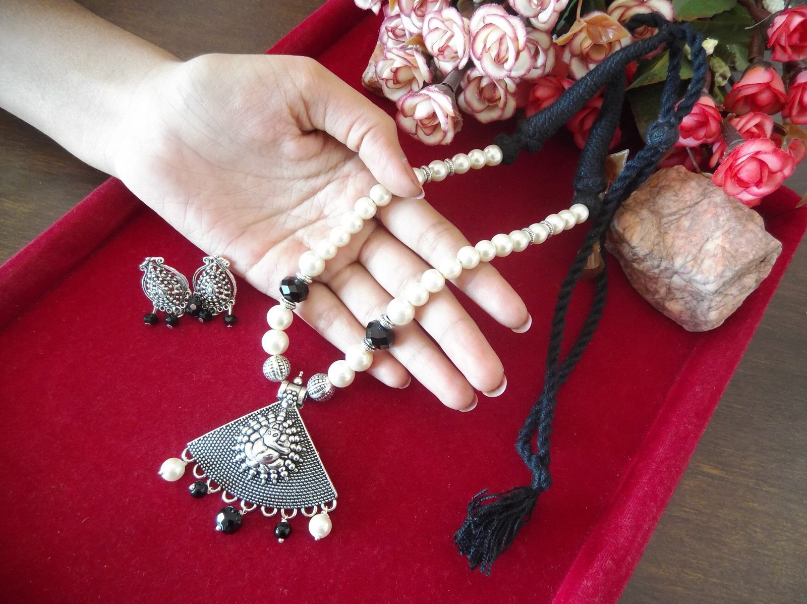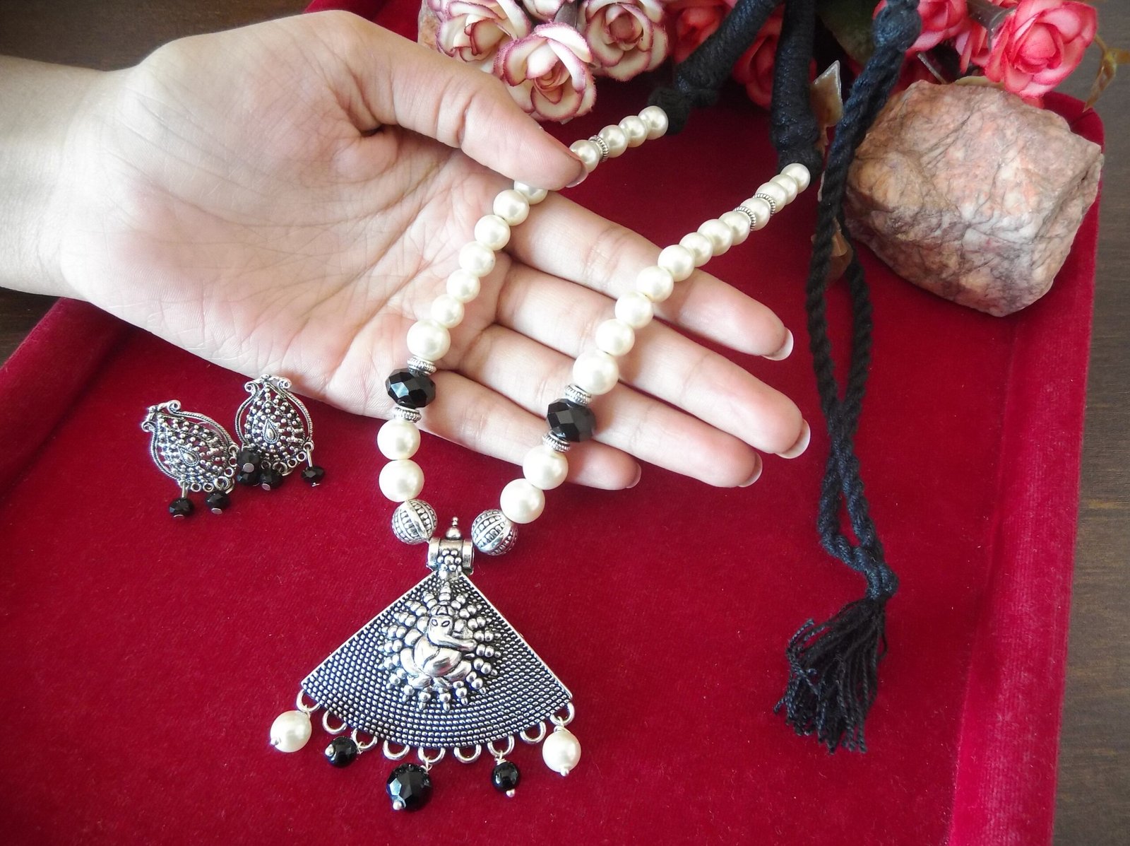 Perfect for formal events or special occasions, this handcrafted necklace set exudes sophistication and grace. Elevate your ensemble with the timeless allure of our Handmade Black Beads and White Pearl Necklace Set.