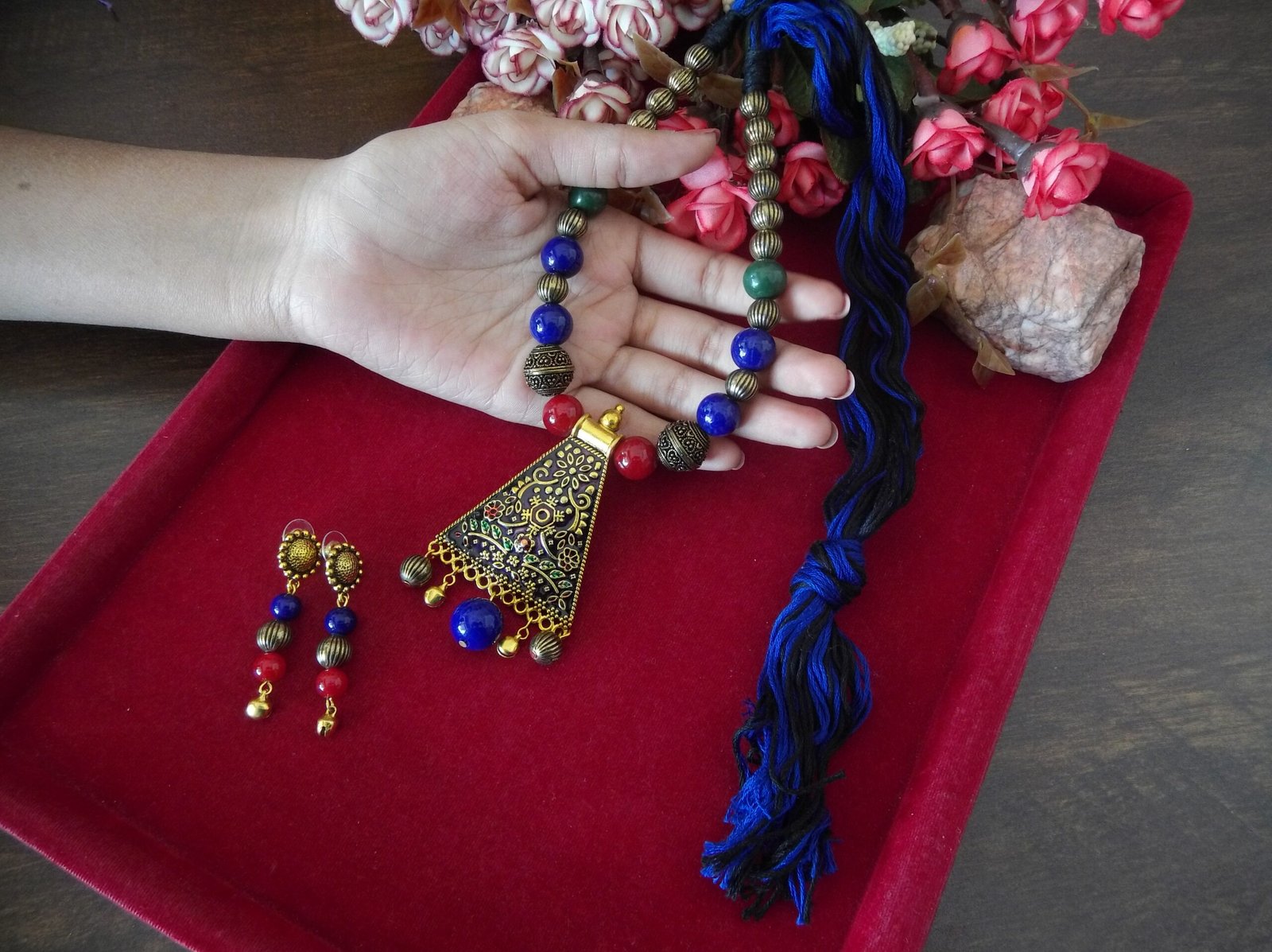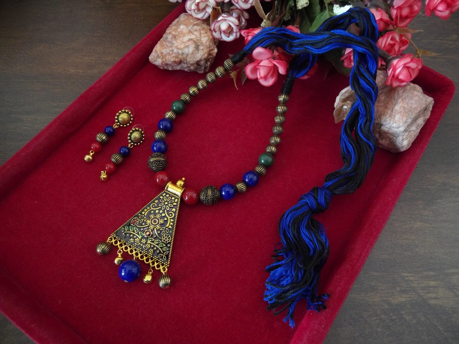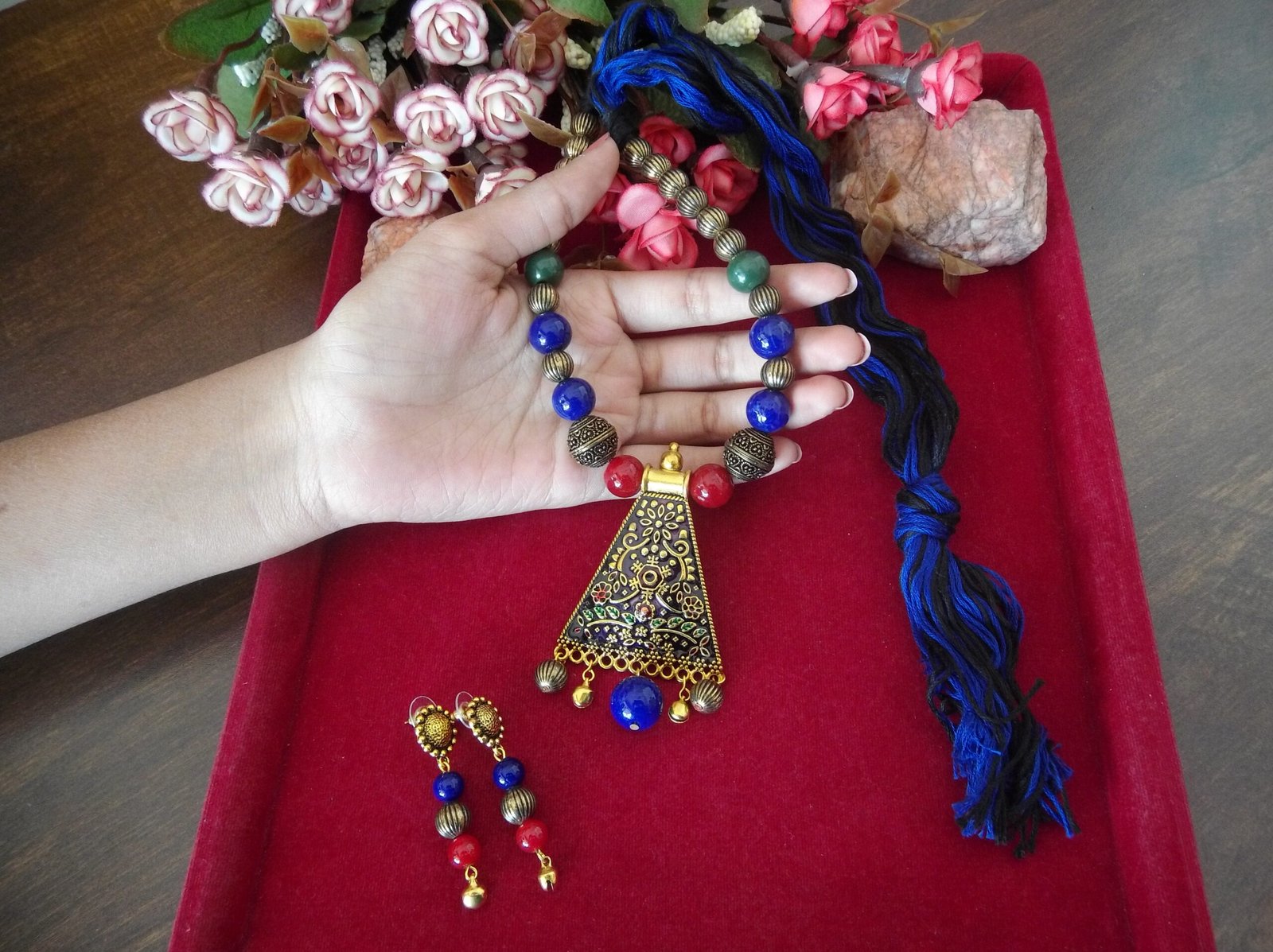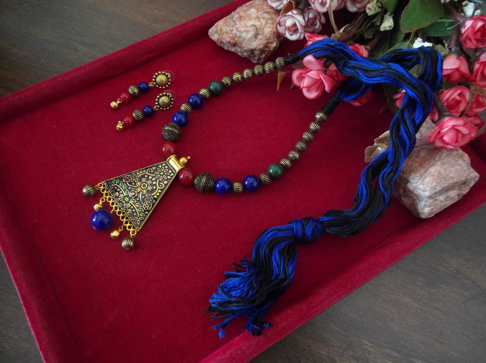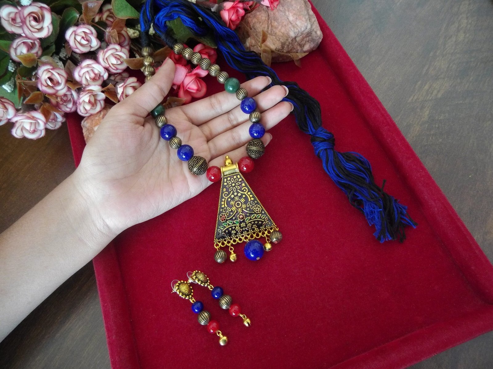 The necklace features a harmonious blend of red, blue, black, and golden beads, meticulously handcrafted to create a captivating color palette. Each bead adds depth and dimension to the design, while the combination of colors offers versatility and style.