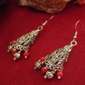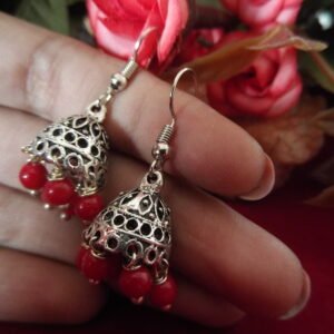 Silver Color Oxidized Hanging Earrings with vibrant red beads